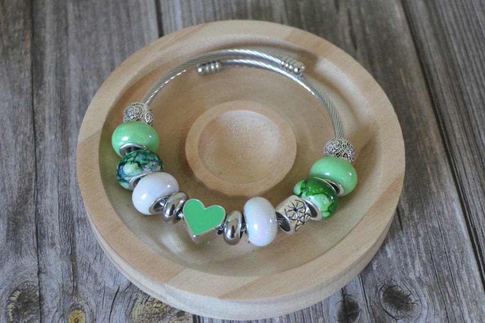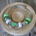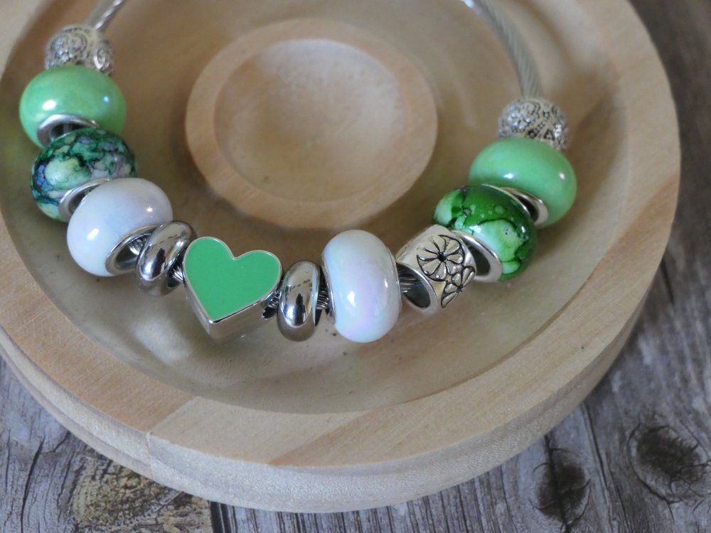 Bracelet chaîne serpent sans fermoir avec perles européennes /Cœur/vert