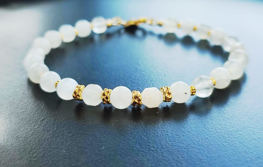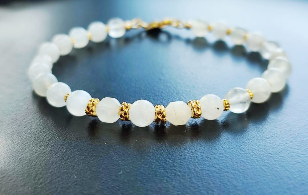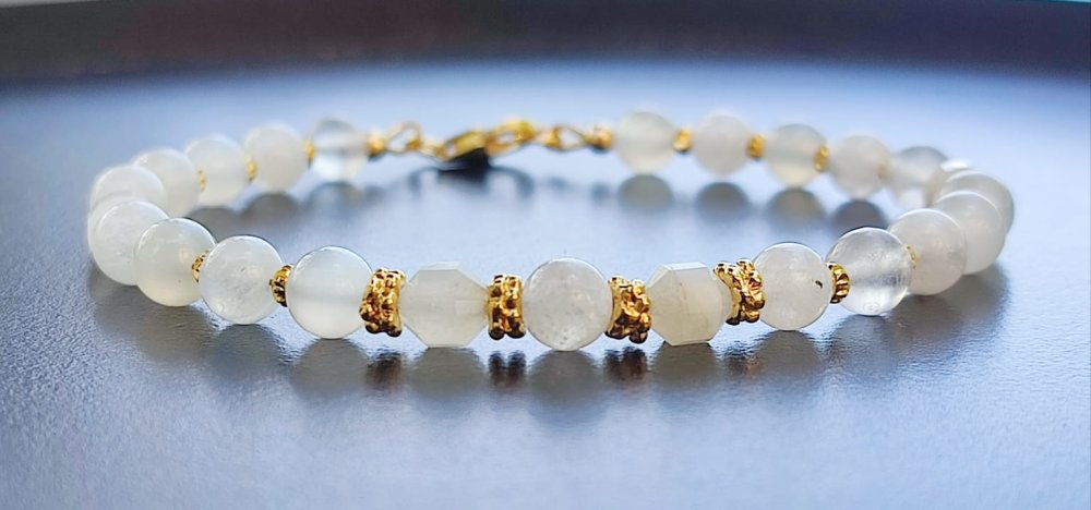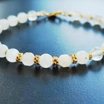 Bracelet en perles de Pierre de Lune de 6 mm , associé à des perles en plaqué or 18K. Monté sur un fil câblé doré (Beadalon 19 brins) , il est à la fois souple et résistant. le montage est fait en gold filled.