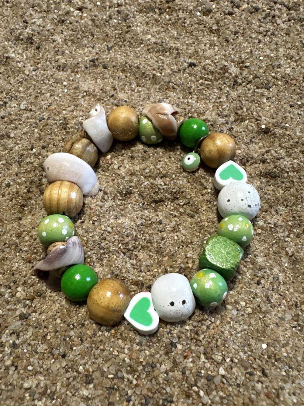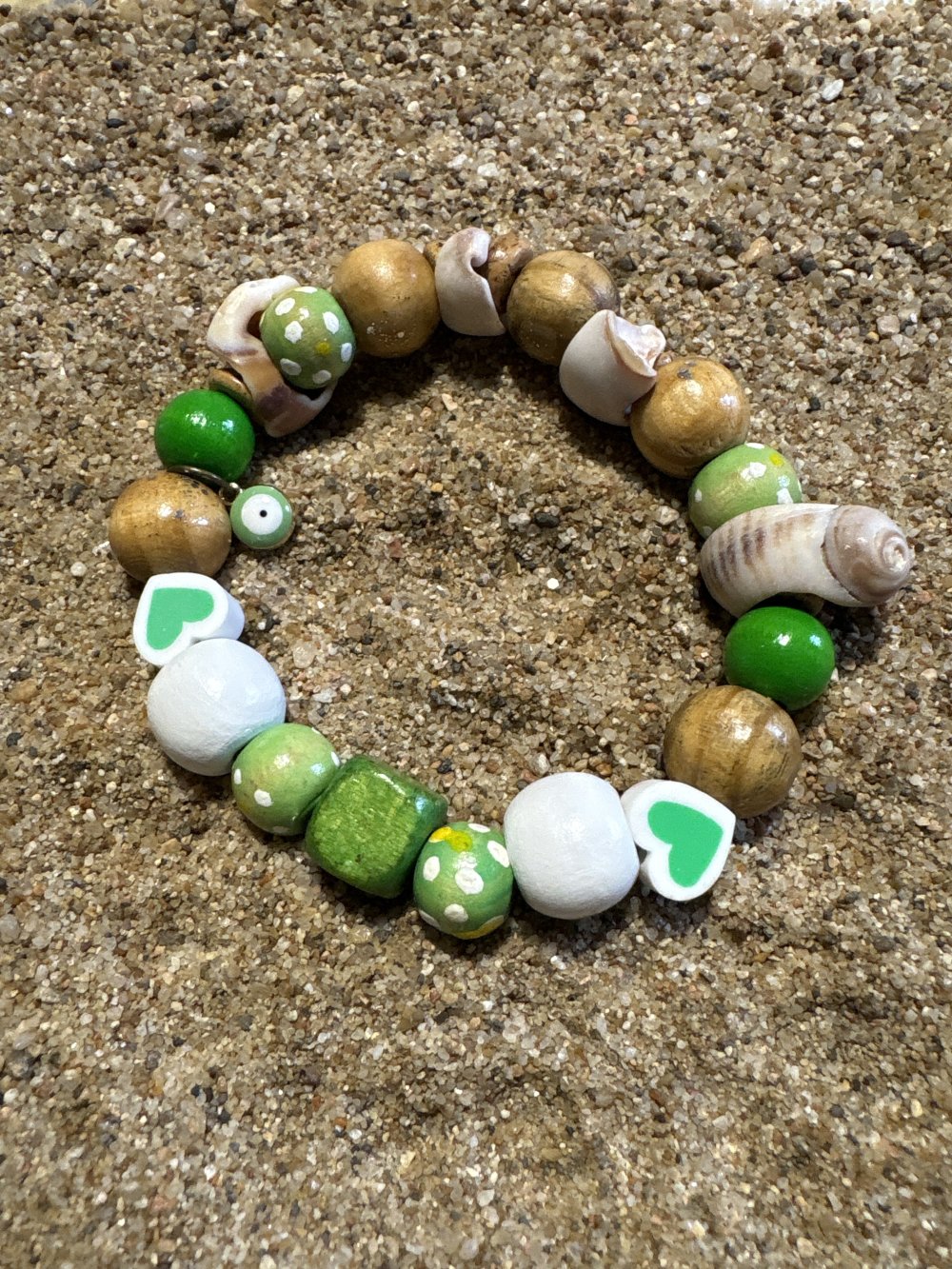 Réalisé avec des perles de bois des cœurs des coquillages dans les tons de beige blanc et vert pomme