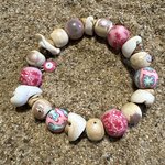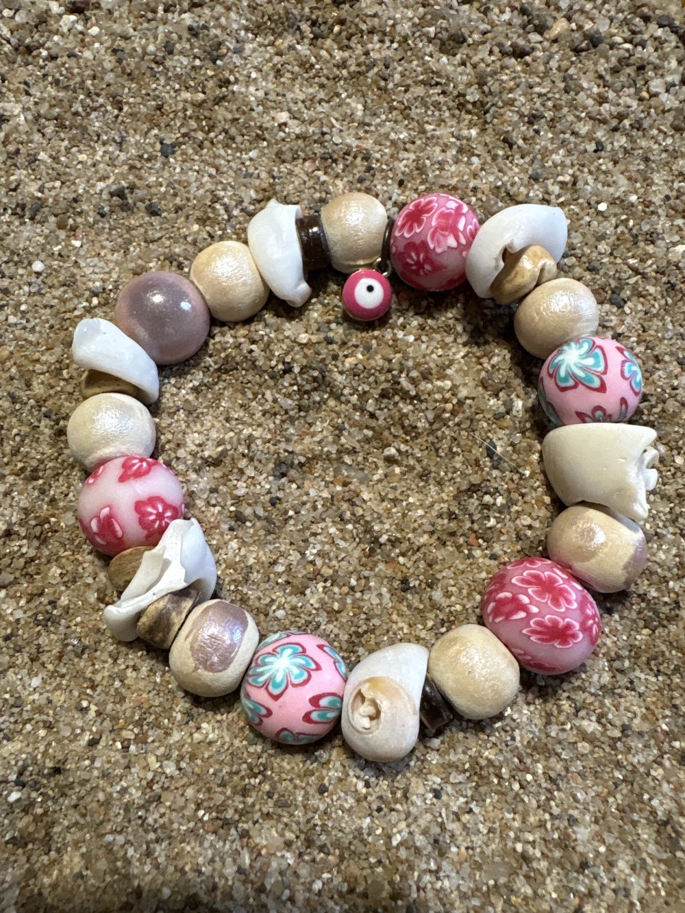 Ce bracelet est réalisé avec des perles de bois vernis et des perles polymère rose à fleurs ainsi que une perle rose magique et des coquillages