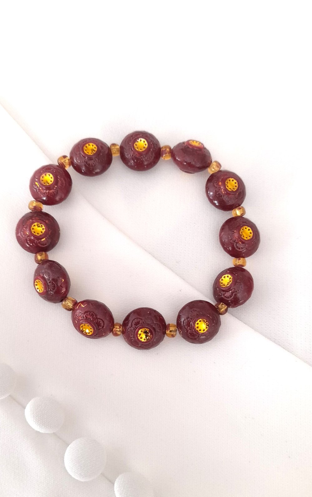 Les perles rondes aplaties, teintes d'une jolie couleur bordeaux foncé,dorées au centre, alternent avec des petites perles en verre doré .
