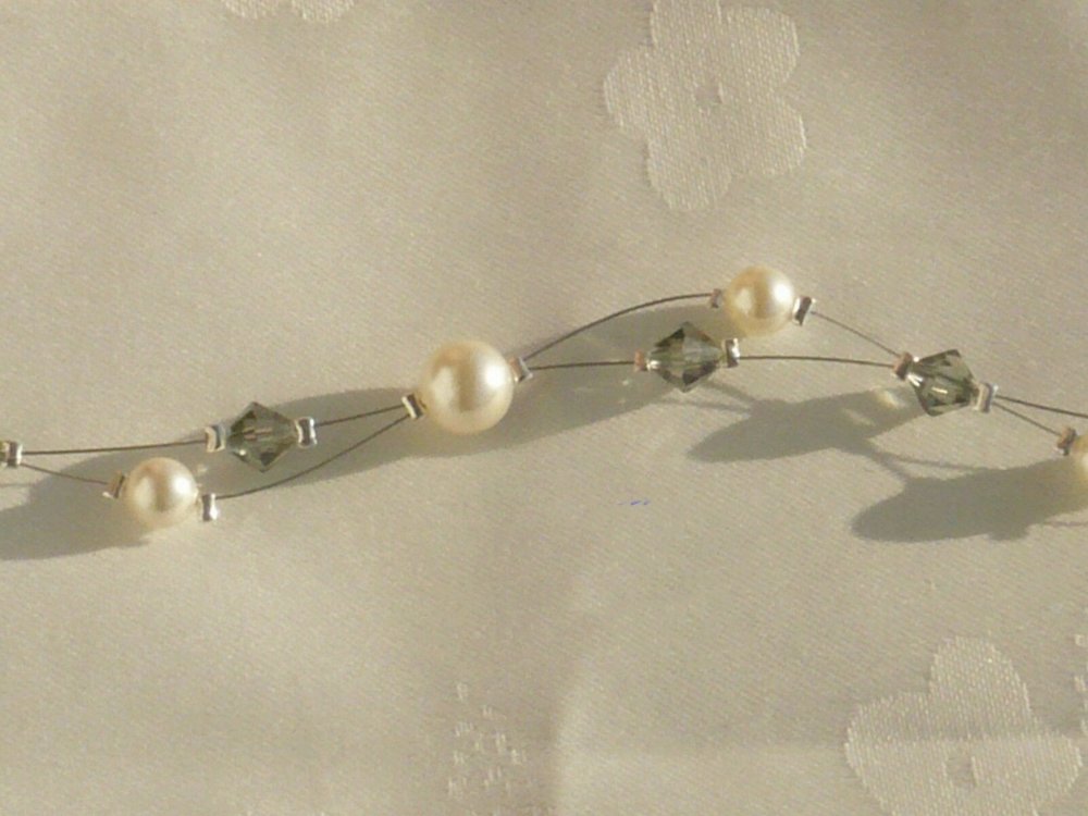 Composé de rondes nacrées 4, 6, 8 mm et toupies 6 mm en cristal de swarovski, sur fil câblé argenté, sans nickel.