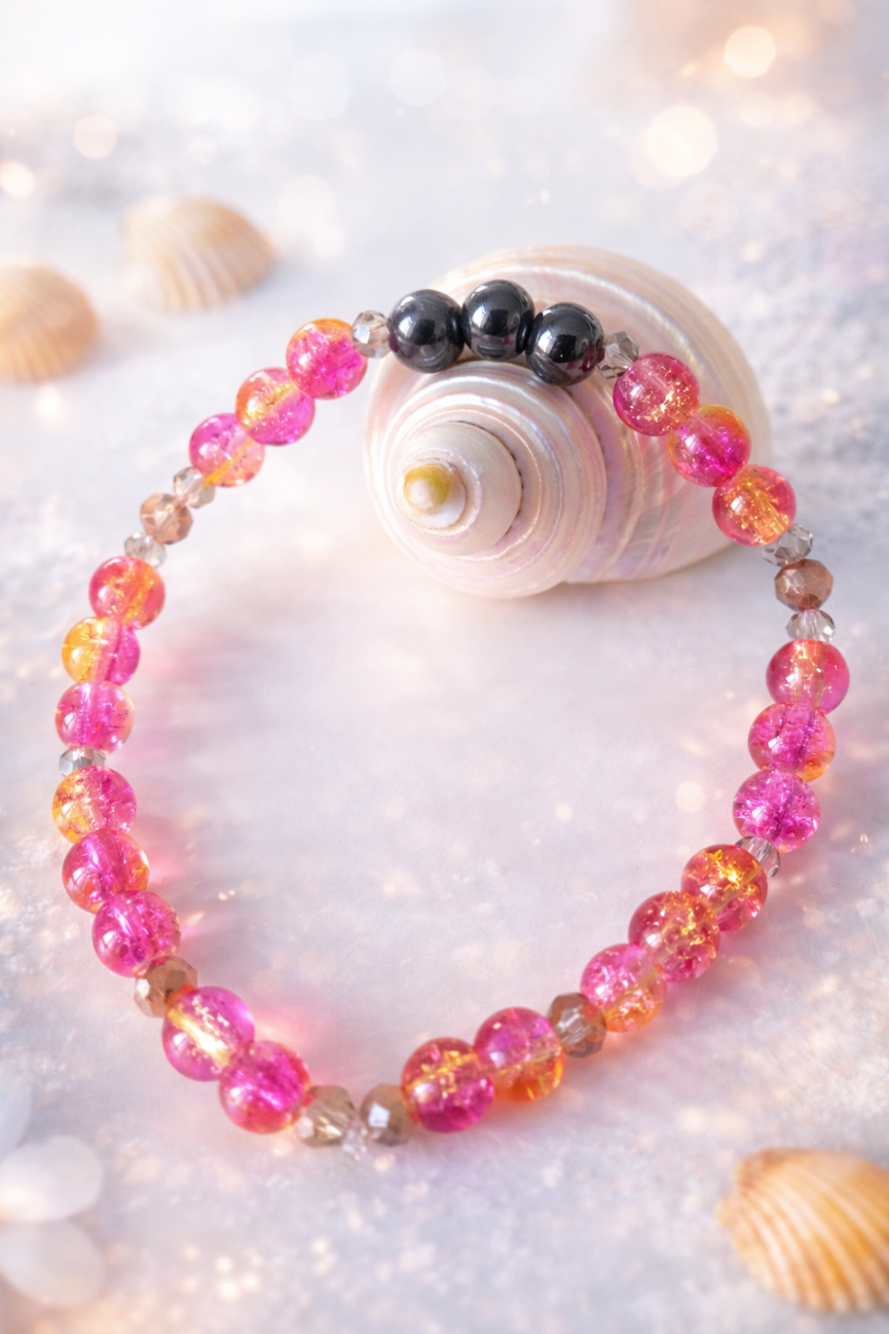 Délicat et lumineux, le bracelet Éclat d’Âme associe de douces perles roses aux reflets chaleureux à l’élégance profonde des perles d’hématite ✨. Monté sur un fil élastique de 16 cm, il épouse naturellement le poignet et apporte une touche à la fois féminine, lumineuse et apaisante. Ses nuances rosées évoquent la douceur, la joie du cœur et la délicatesse de l’âme 🌸💞.