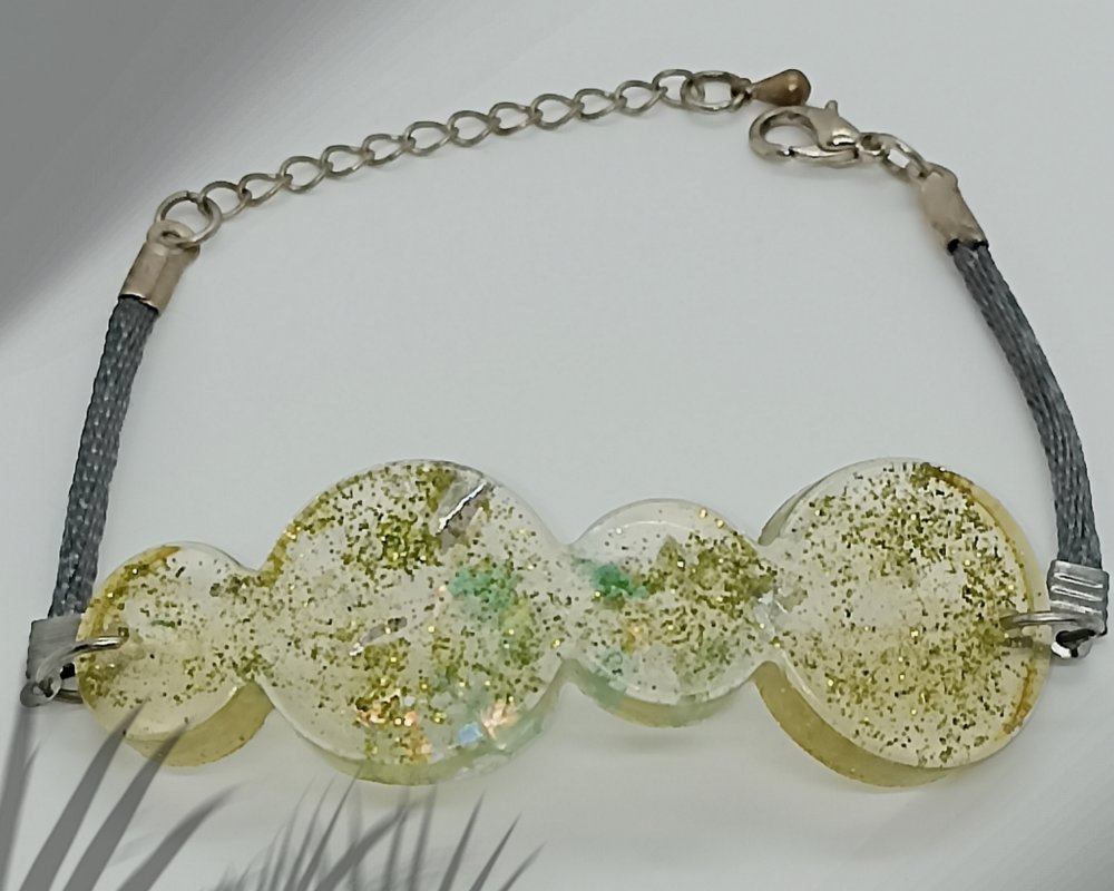 Bracelet en résine époxy teinté à l'encre verte et monté sur une chaîne en acier inoxydable