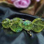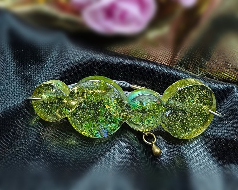 La résine teintée à l'encre verte et jaune pâle est saturée de paillettes fines et d'éclats de mica, donnant l'impression d'un fragment de nature magique et luxueux.