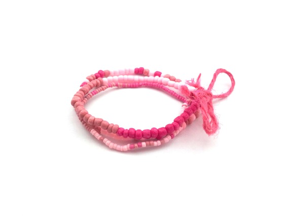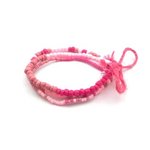Bracelet élastique à perles de rocaille rose. Les perles de rocaille sont de différentes tailles. Le tout accroché avec un cordon de chanvre rose.