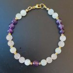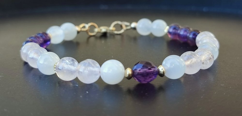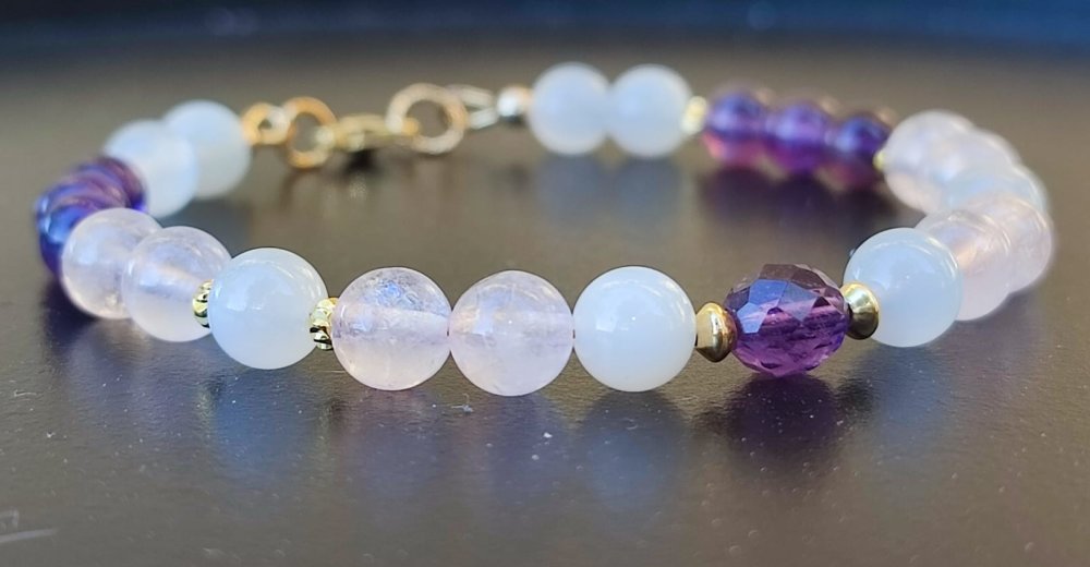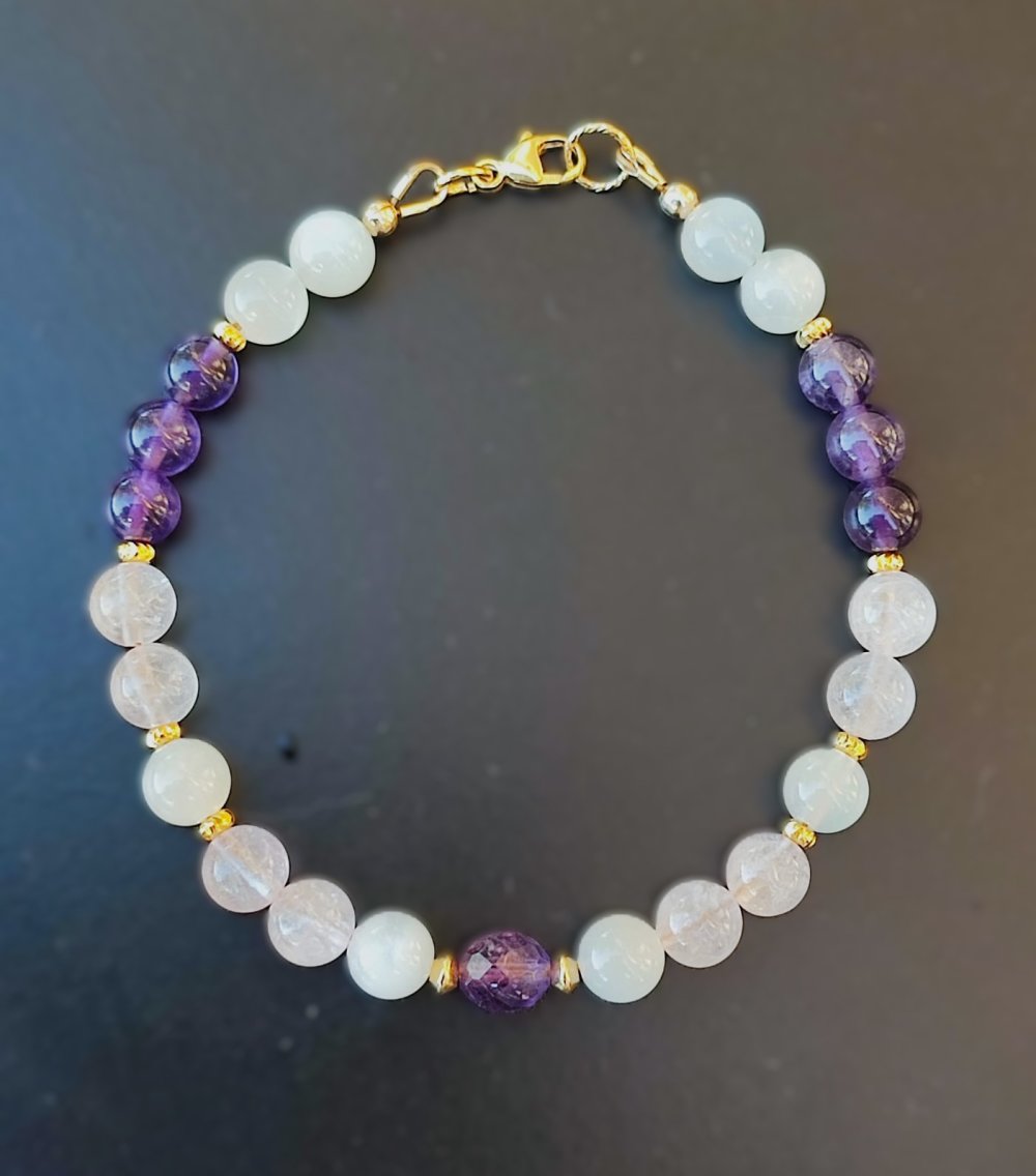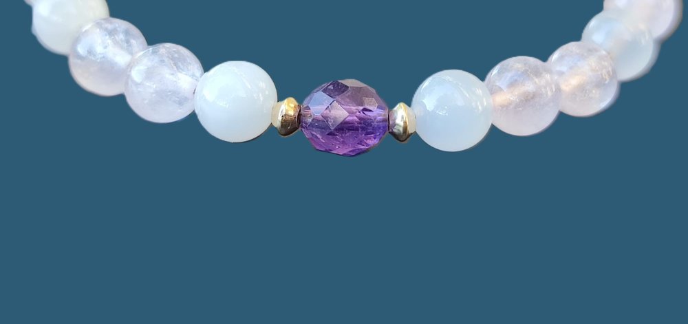 Ce bracelet délicat associe la tendresse du Quartz Rose, la sagesse de l’Améthyste et la féminité de la Pierre de Lune.