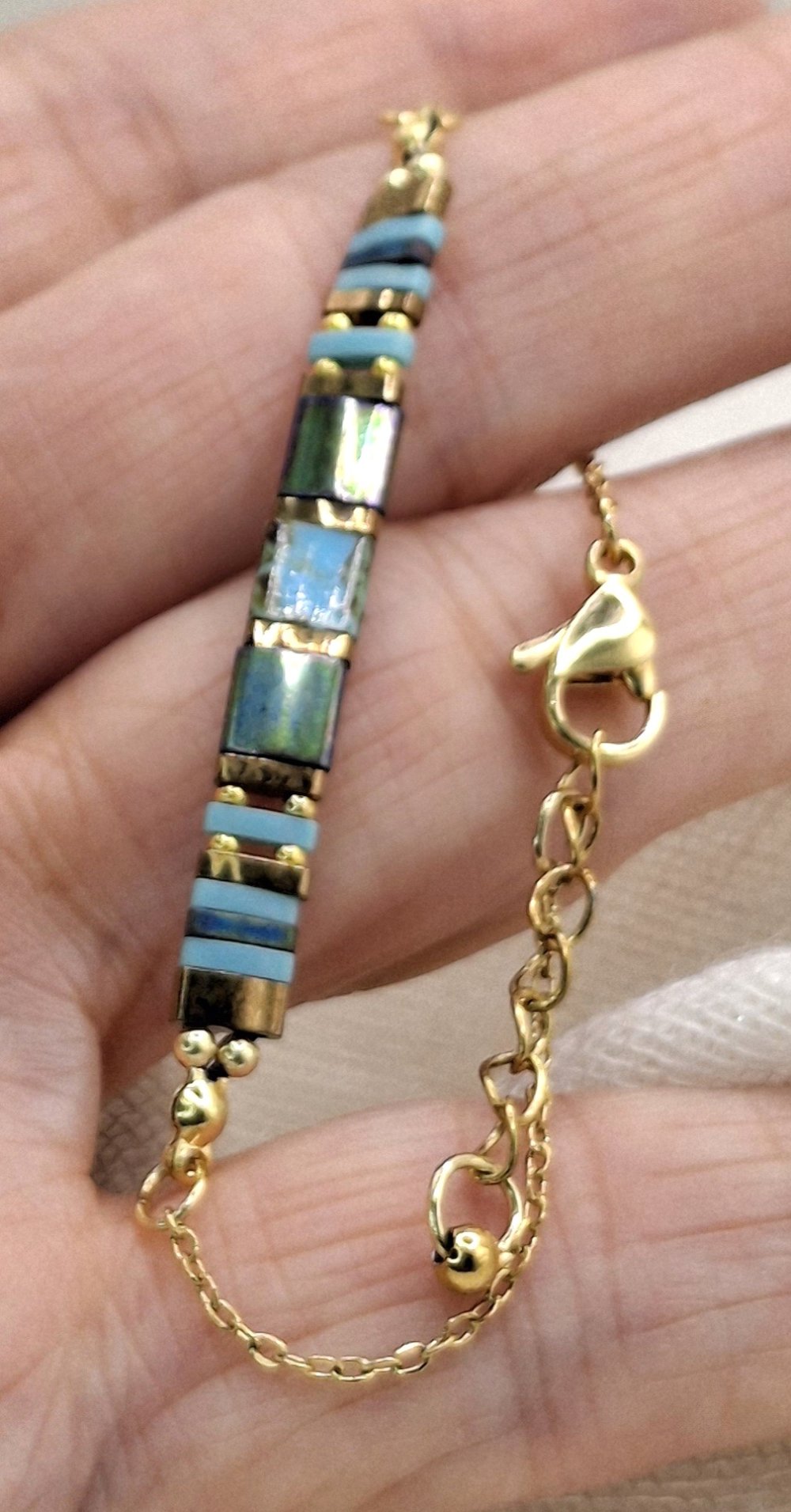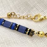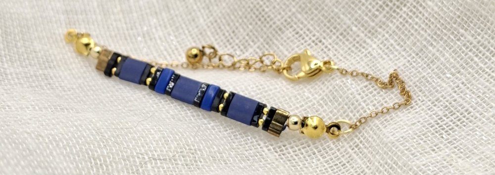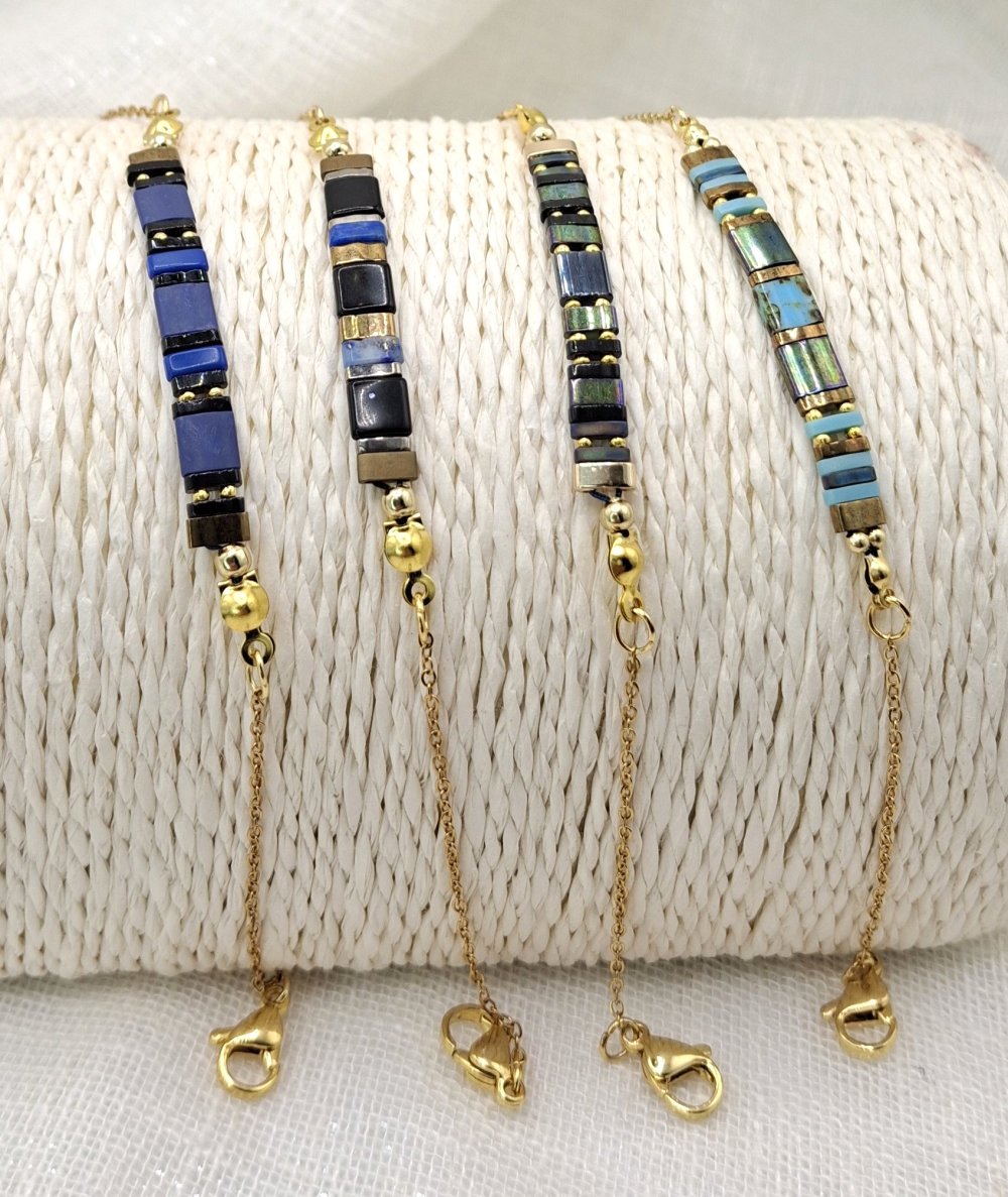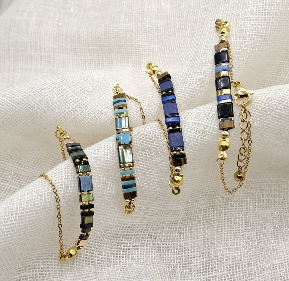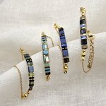 Bracelets chaîne acier inoxydable doré et perles miyuki Half Tila, dans les nuances de bleu.