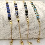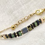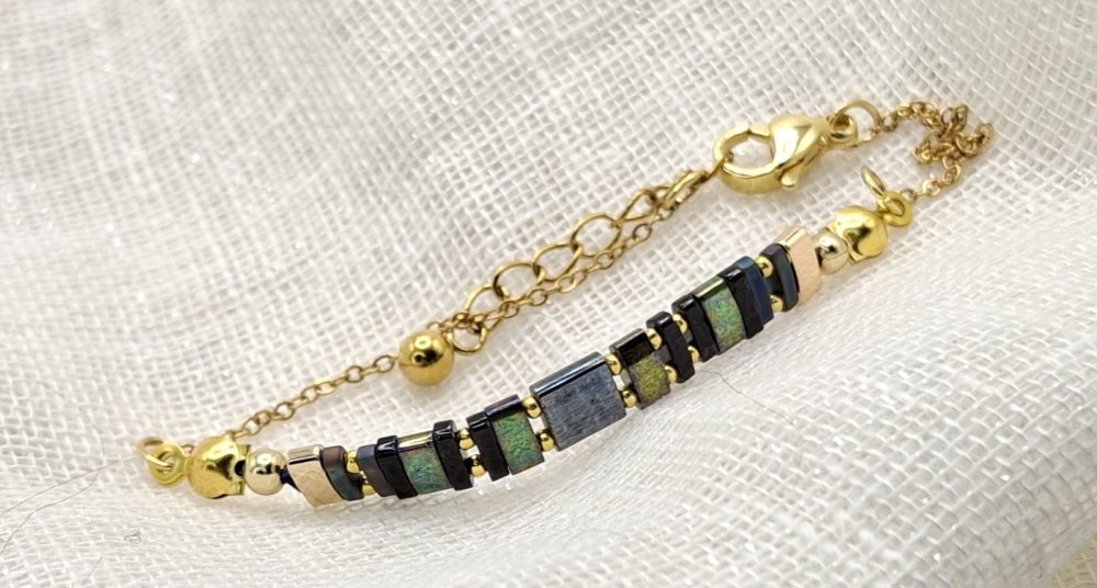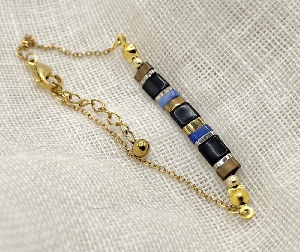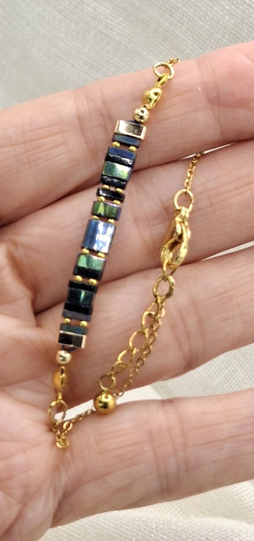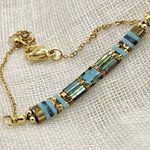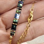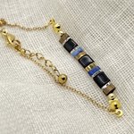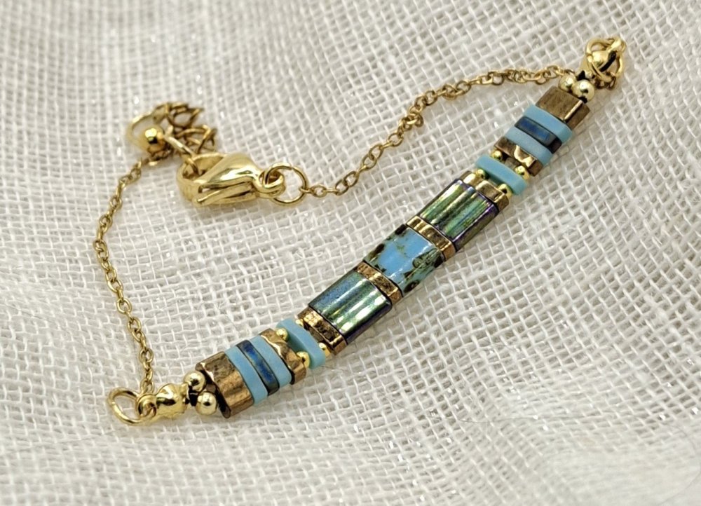 Bracelets chaîne acier inoxydable doré et perles miyuki Half Tila, dans les nuances de bleu.
