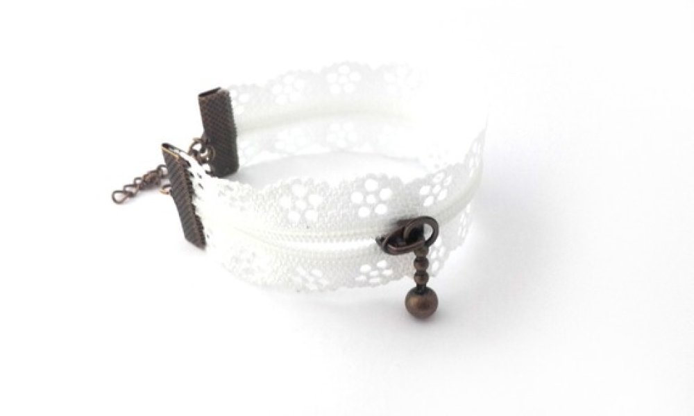 Bracelet fermeture éclair en dentelle. Le fermoir mousqueton en métal couleur bronze et la dentelle blanche en polyester.