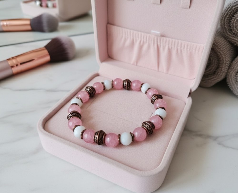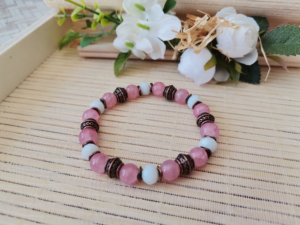 * Détail : bracelet sur fil élastique avec perles en verre craquelé et à facette avec apprêts de couleur cuivre rouge