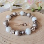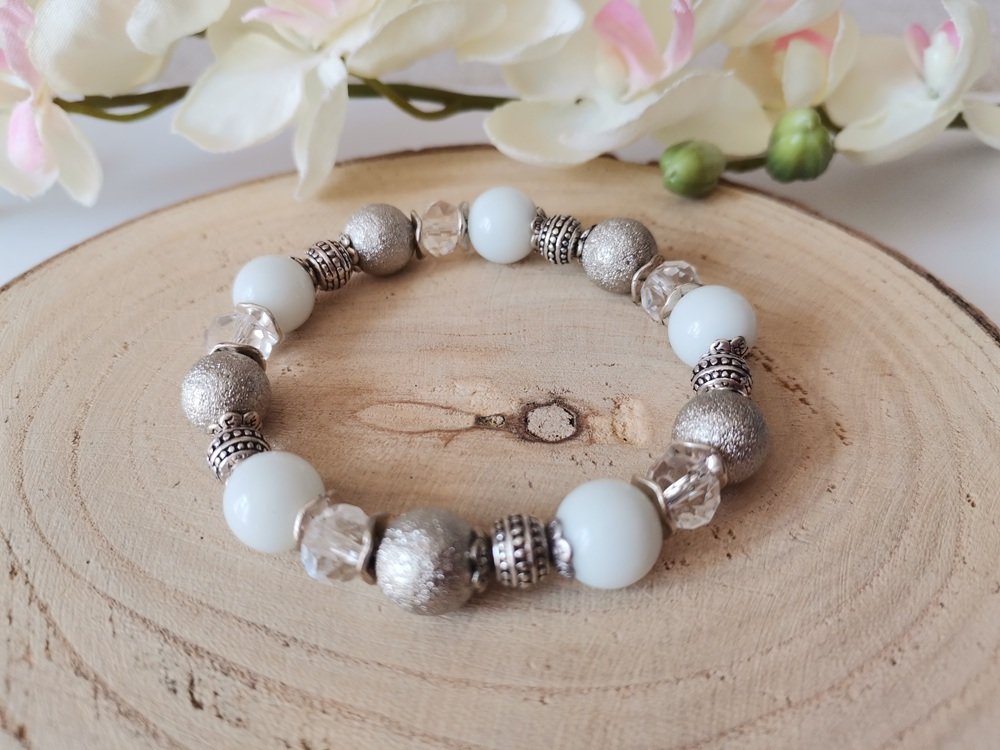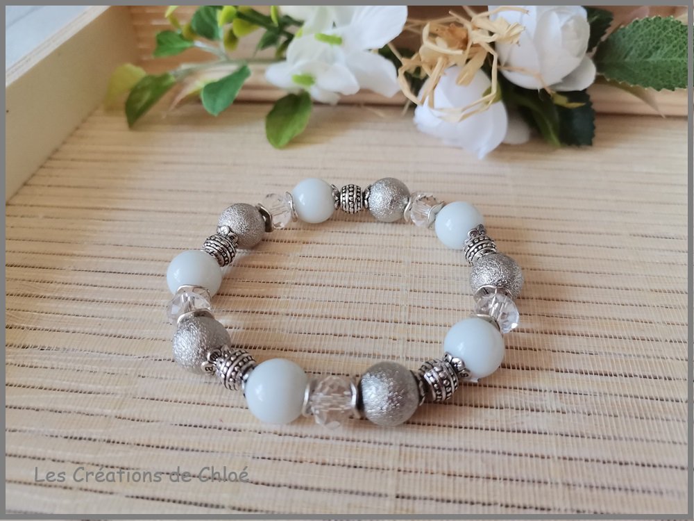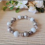 * Détail : bracelet sur fil élastique avec perles en verre imitation jade 10 mm de couleur blanche, perles métal de 10 mm de couleur argentées, perles à facettes cristal 8 x 6 mm et apprêts de couleur argent mat