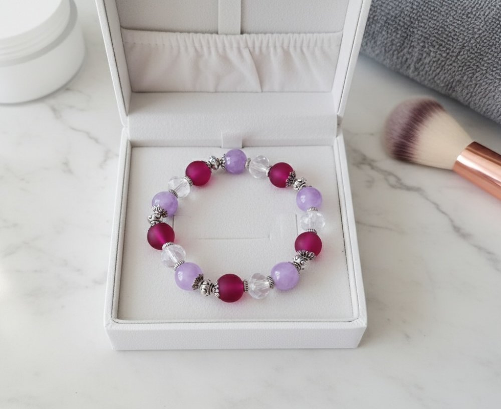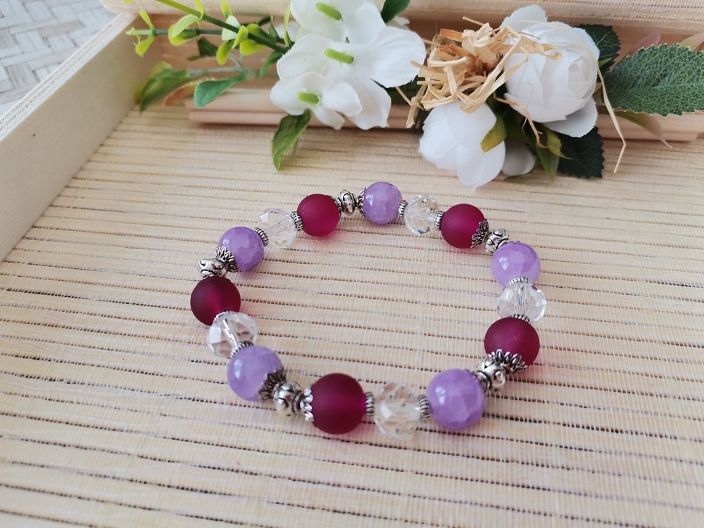 Bracelet sur fil élastique composé de perles en verre givré de couleur violette de 10 mm, perles en verre craquelé lilas 10mm et perles en verre cristal à facette de 10 x 8 mm . Apprêts de couleur argent mat