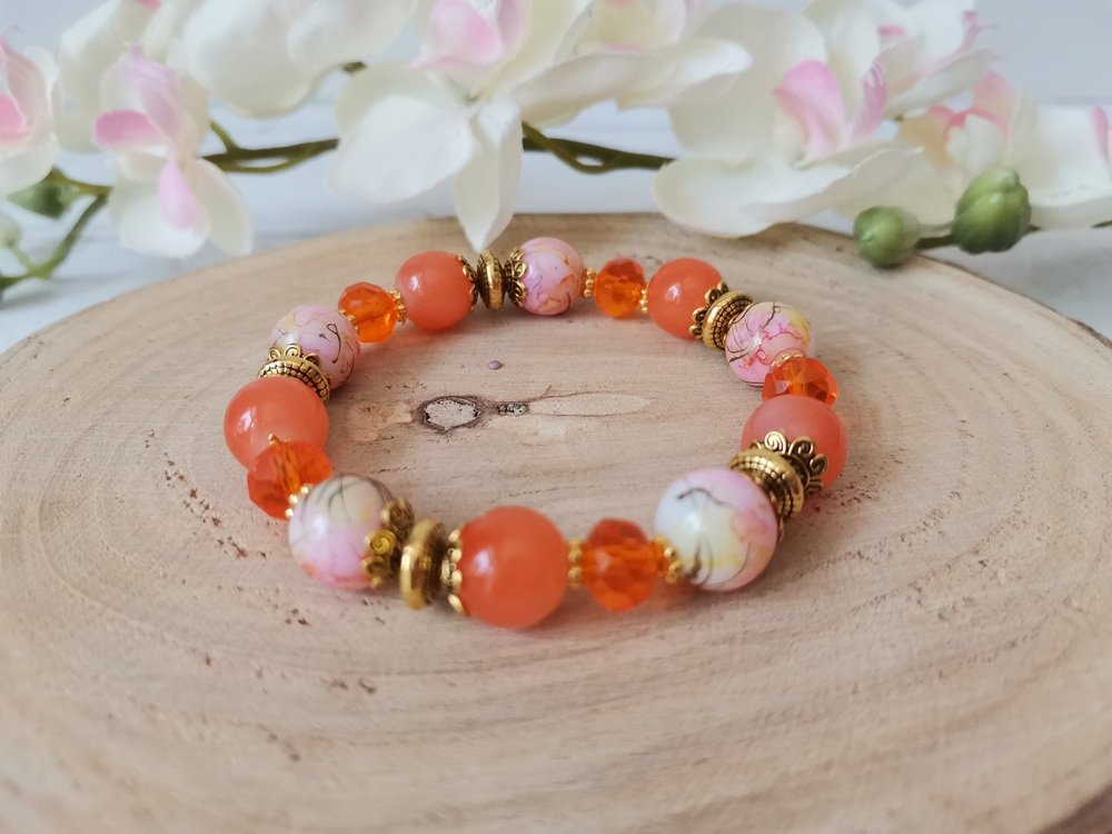 * Détail : bracelet sur fil élastique avec perles imitation jade orange de 10 mm, perles en verre tréfilé de 10 mm, perles en verre à facette orange de 8 mm avec apprêts de couleur doré
