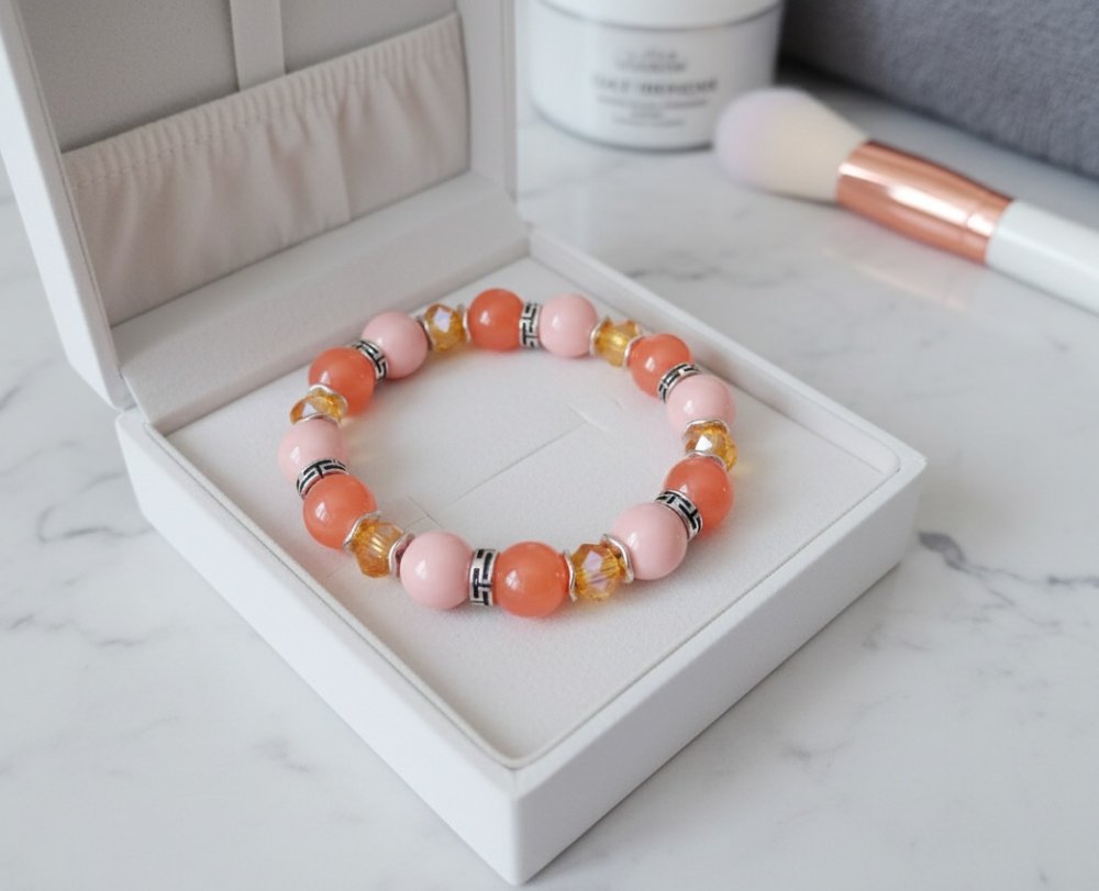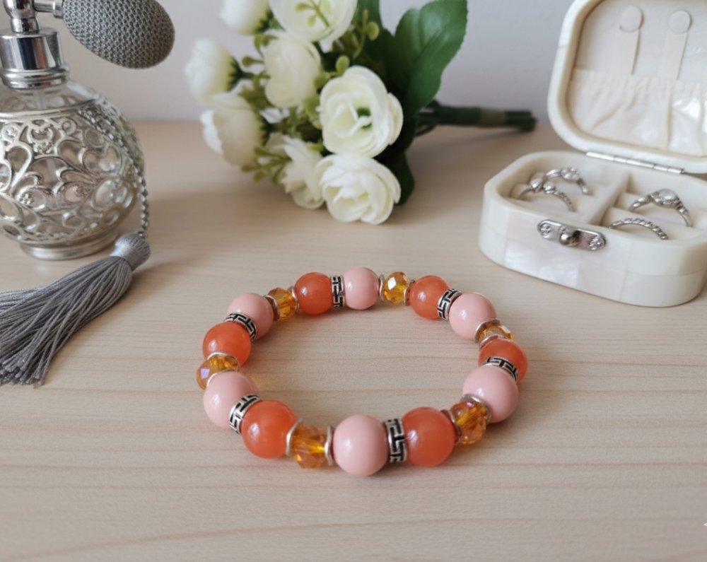 * Détail : bracelet sur fil élastique avec perles imitation jade orange de 10 mm, perles en verre orange pale de 10 mm, perles en verre à facette orange AB de 8 mm avec apprêts de couleur argent mat