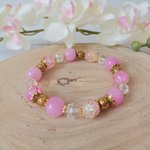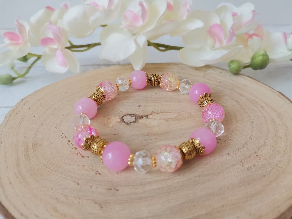 * Détail : bracelet sur fil élastique avec perles imitation jade rose de 10 mm, perles en verre craquelé de 10 mm, perles en verre à facette cristal de 8 mm avec apprêts de couleur doré