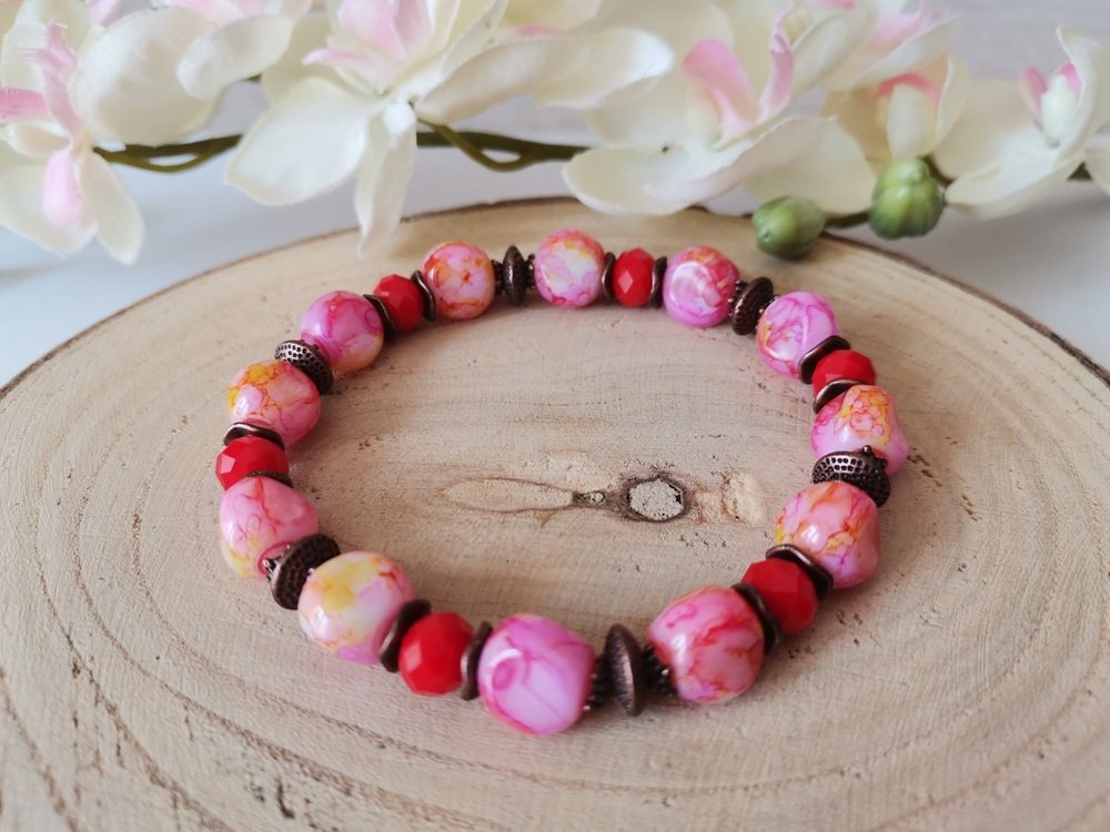 * Détail : bracelet sur fil élastique avec perles en verre de 10 mm de couleur rose et orangé, perles à facettes rouge 8 x 6 mm et apprêts de couleur cuivre rouge