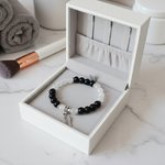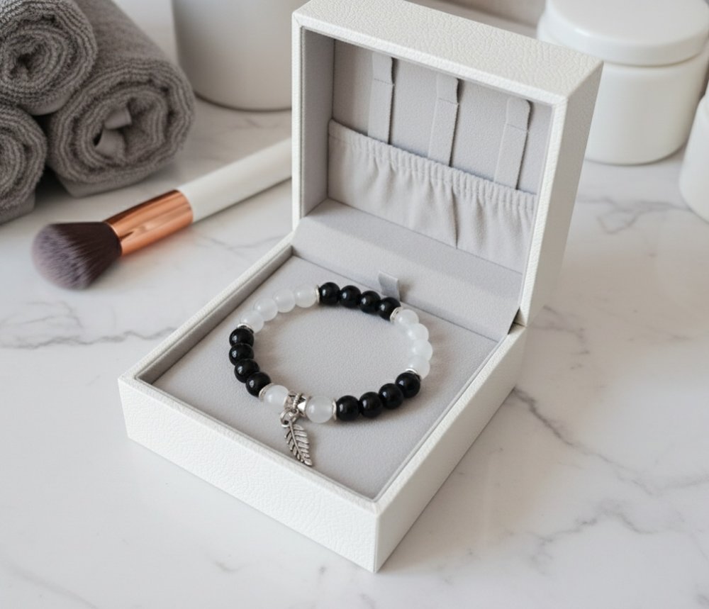 * Détail : bracelet sur fil élastique avec perles en verre de 8 mm avec apprêts de couleur argent mat et breloque feuille