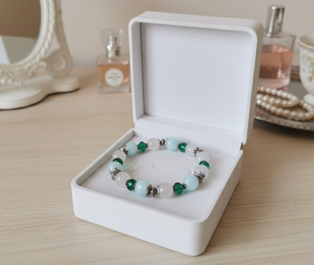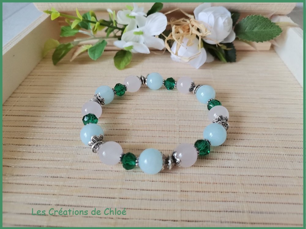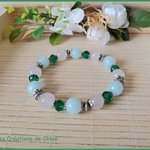 * Détail : bracelet sur fil élastique avec perles jade de couleur bleu pale, perles en verre imitation jade de couleur blanche, perles en verre à facette vert rubis avec apprêts de couleur argent mat