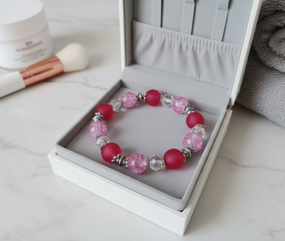 Bracelet sur fil élastique avec perles en verre givré de couleur prune, perles en verre craquelé de 10 mm et apprêts de couleur argent mat