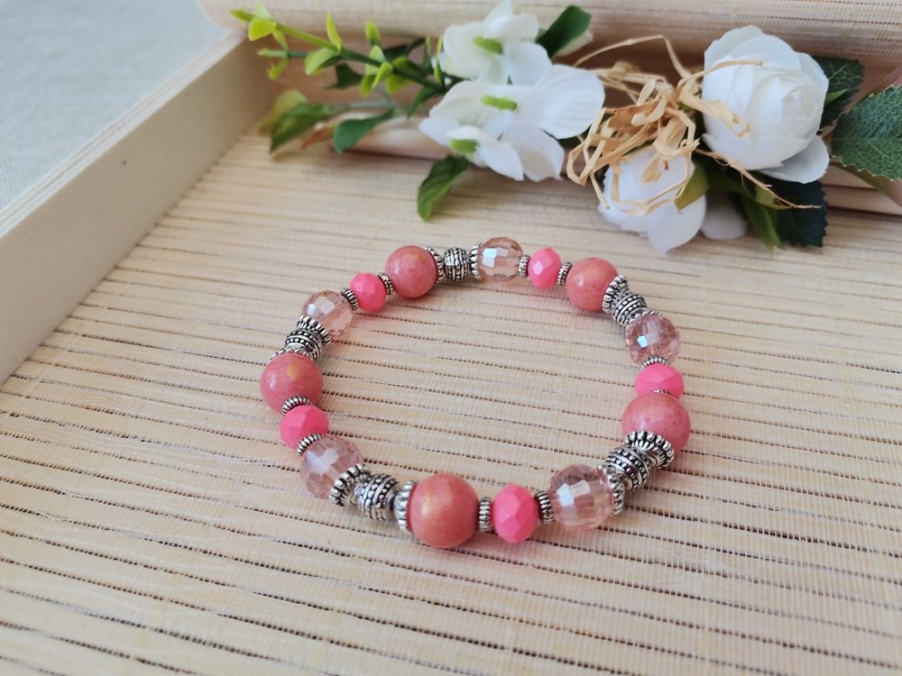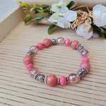 * Détail : bracelet sur fil élastique avec perles jade saumon , perles en verre laqué AB orange , perles en verre à facette saumon opaque avec apprêts de couleur argent mat