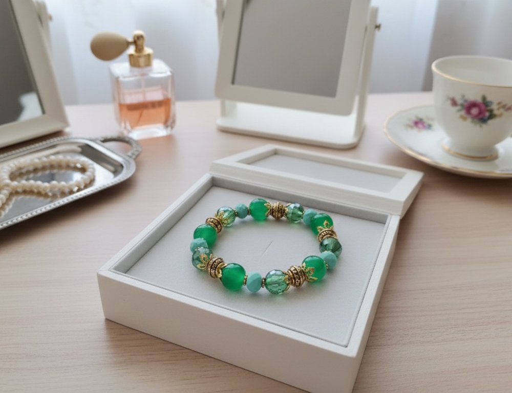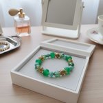 * Détail : bracelet sur fil élastique avec perles imitation jade vertes , perles en verre laqué AB verte , perles en verre à facette vert opaque avec apprêts de couleur doré