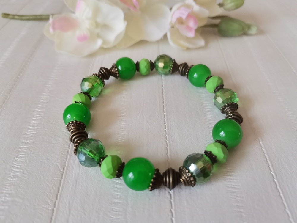 * Détail : bracelet sur fil élastique avec perles imitation jade vertes , perles en verre laqué AB verte , perles en verre à facette vert opaque avec apprêts de couleur bronze