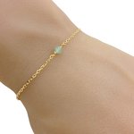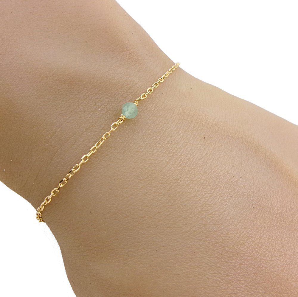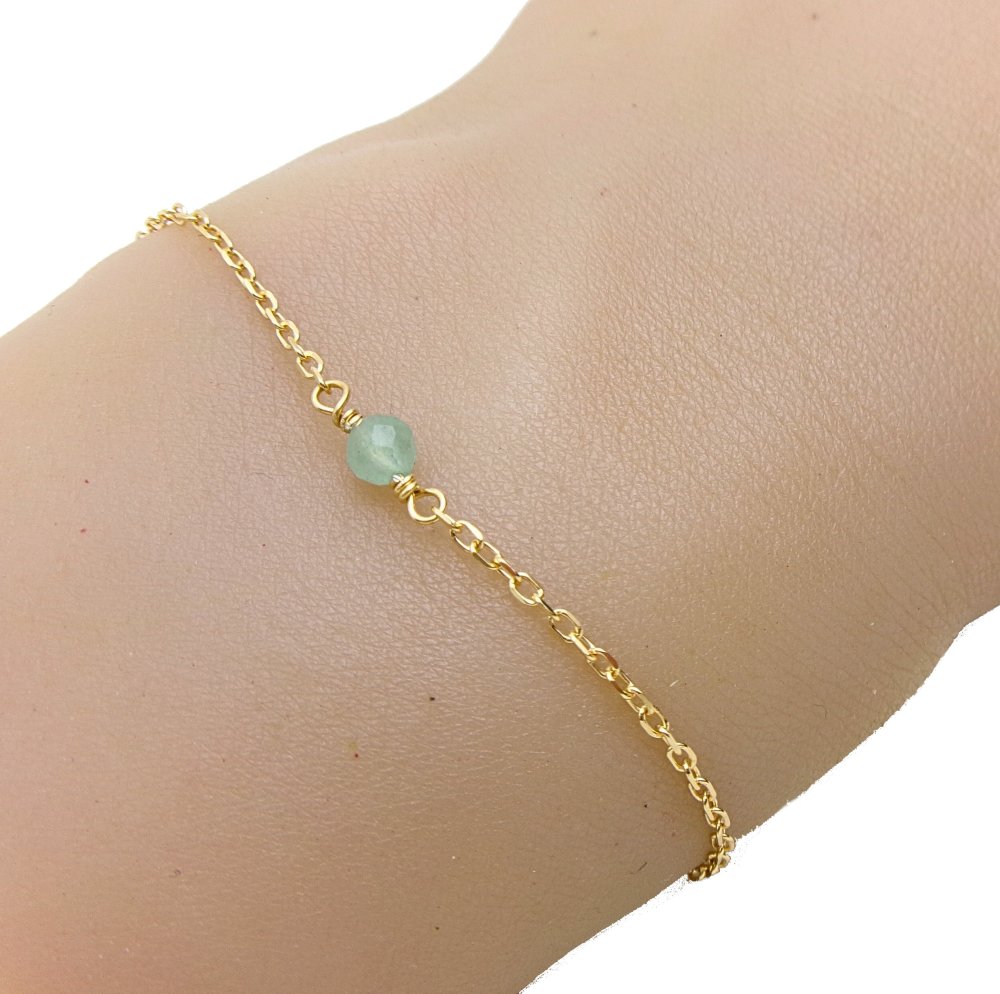 Ce bracelet en or 18 carats est orné d’une pierre naturelle d’aventurine, symbole de douceur et de sérénité.
