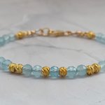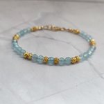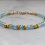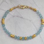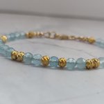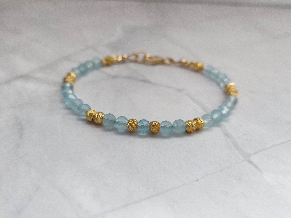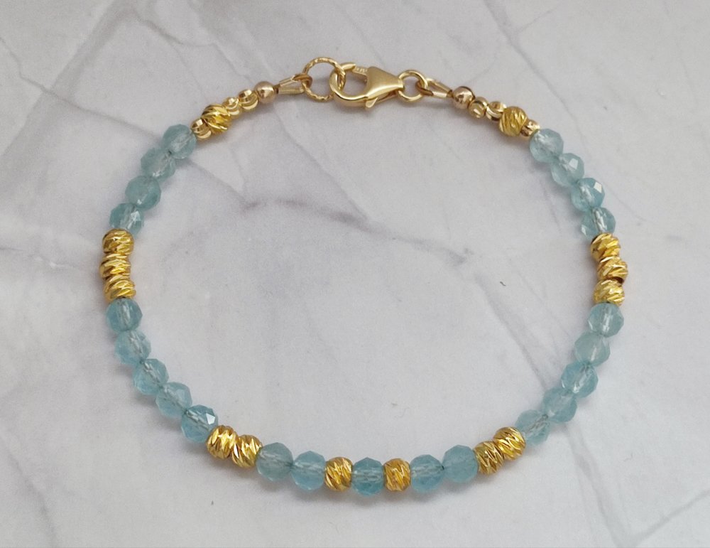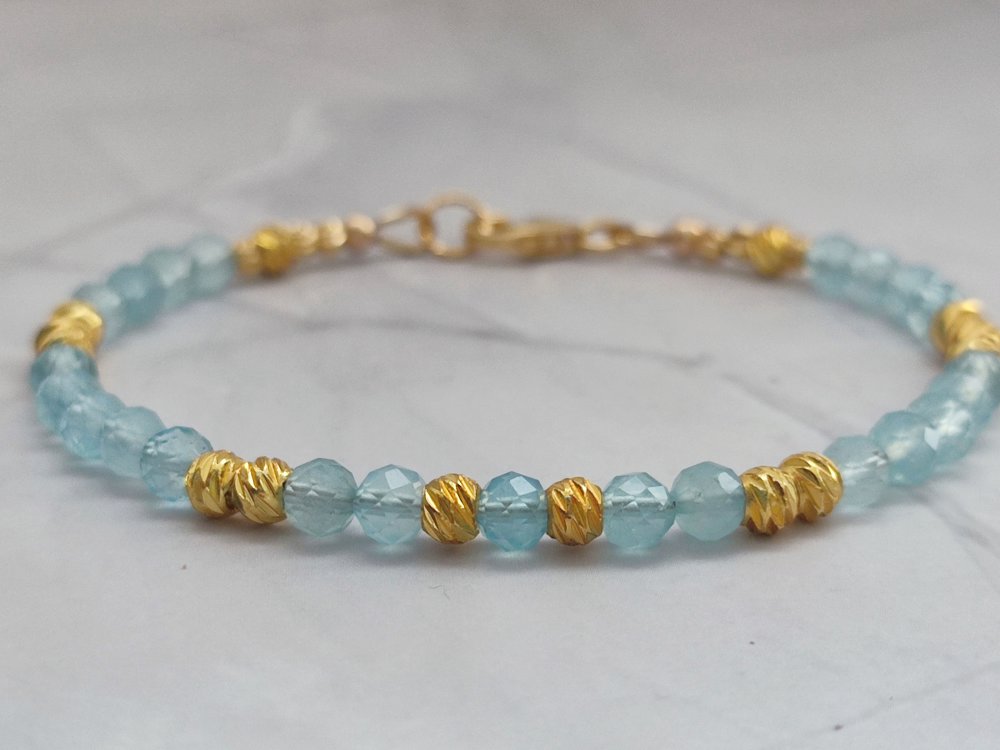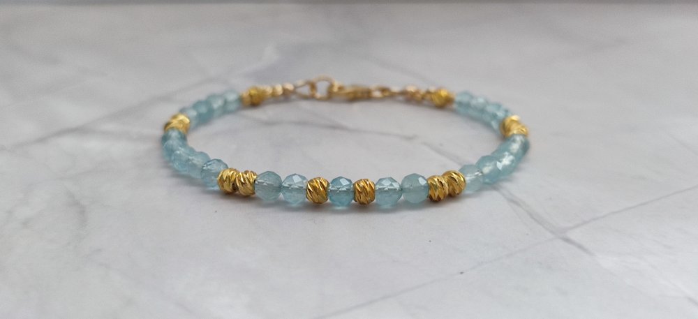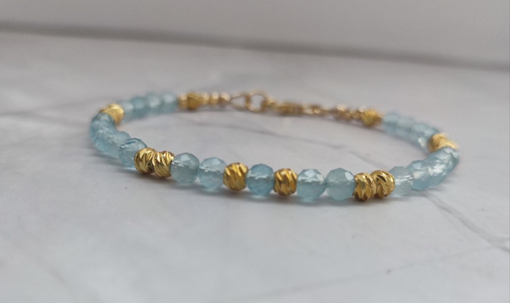 Un bracelet délicat et lumineux en Aigue-marine facettée 4 mm, sublimé par de petites perles ciselées en plaqué or 18K. Un bijou apaisant, élégant et rempli de douceur, parfait pour offrir ou se faire plaisir.