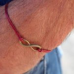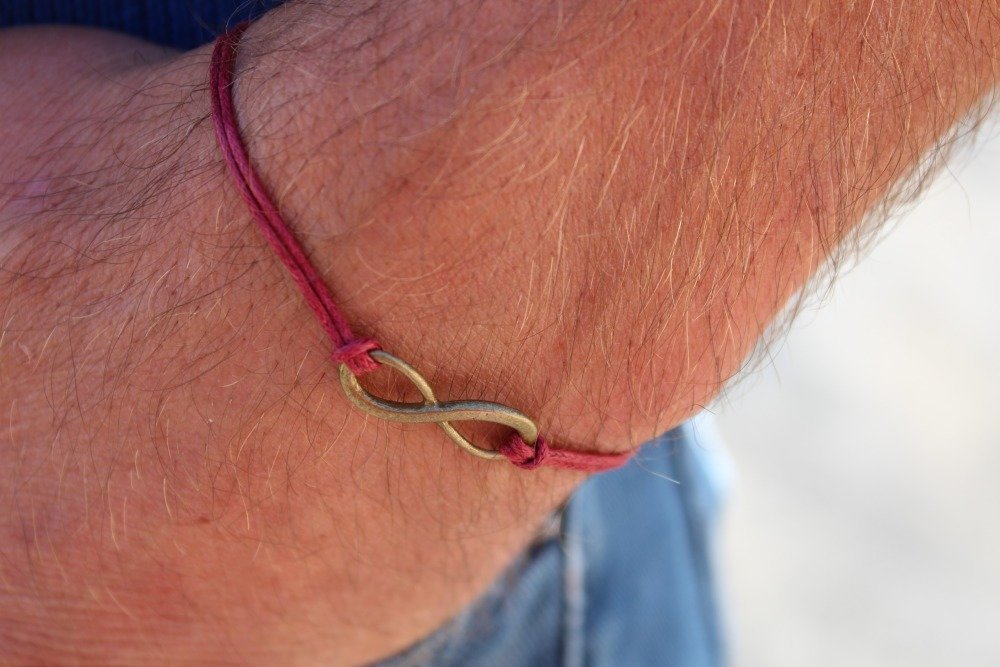 Bracelet infini bordeaux. Le cordon est en coton ciré bordeaux et la breloque est métal couleur bronze.