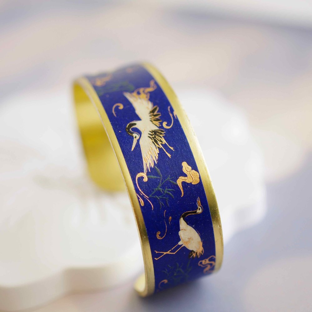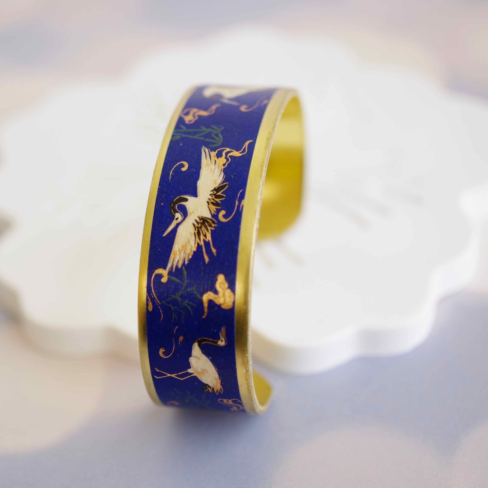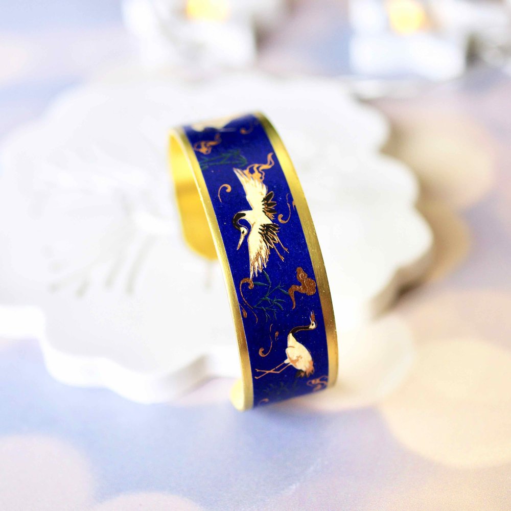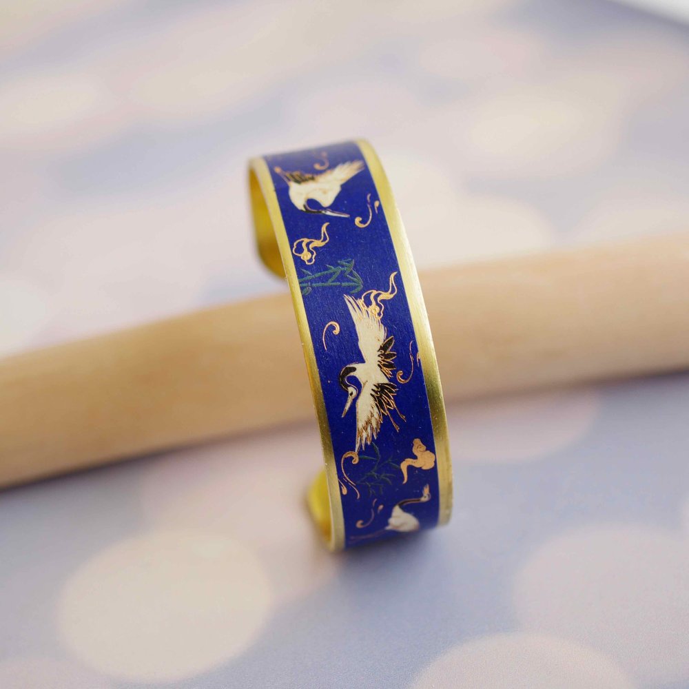 Bracelet jonc manchette, en laiton, papier japonais grue bleu nuit et or, bracelet réglable.