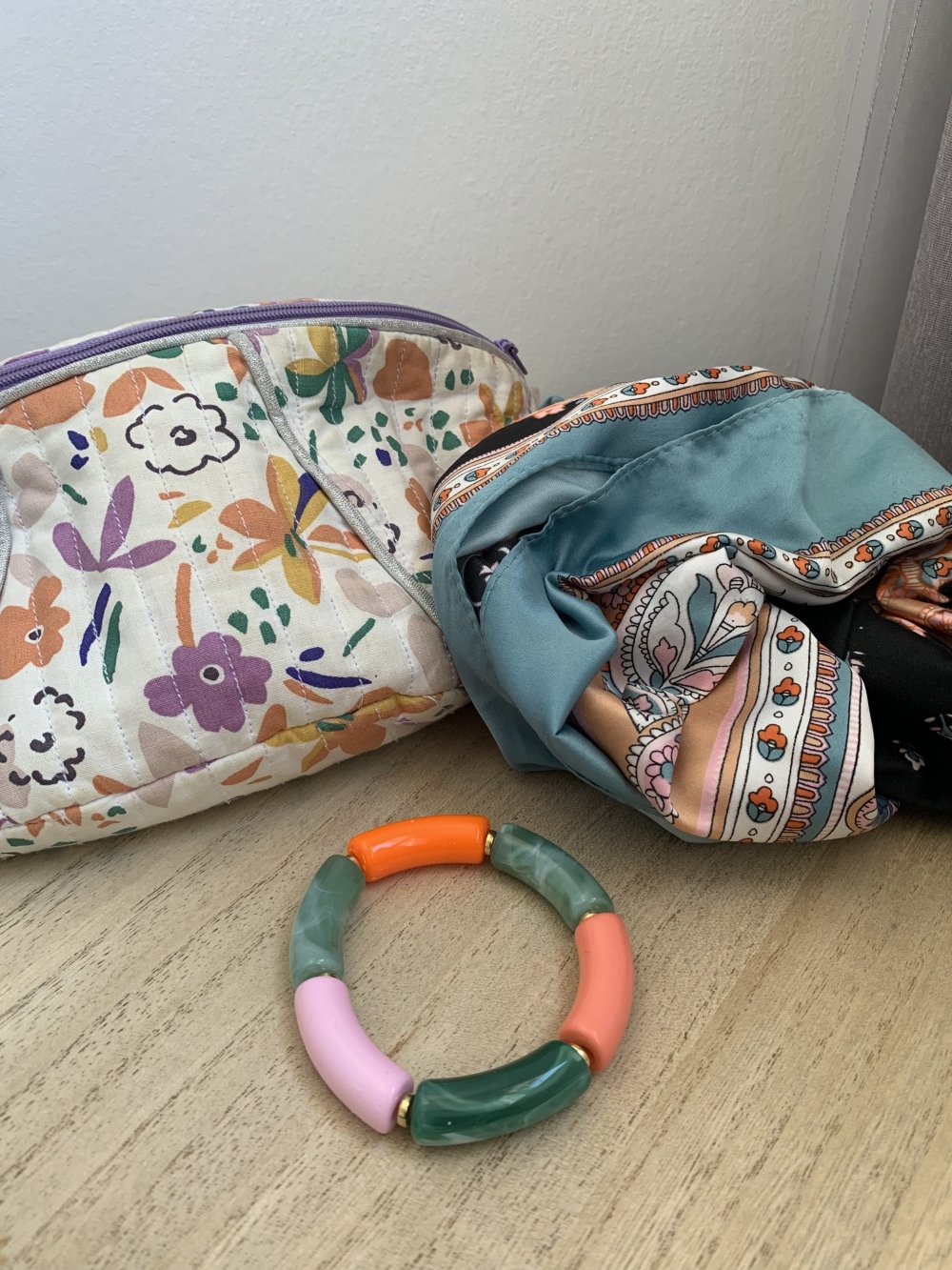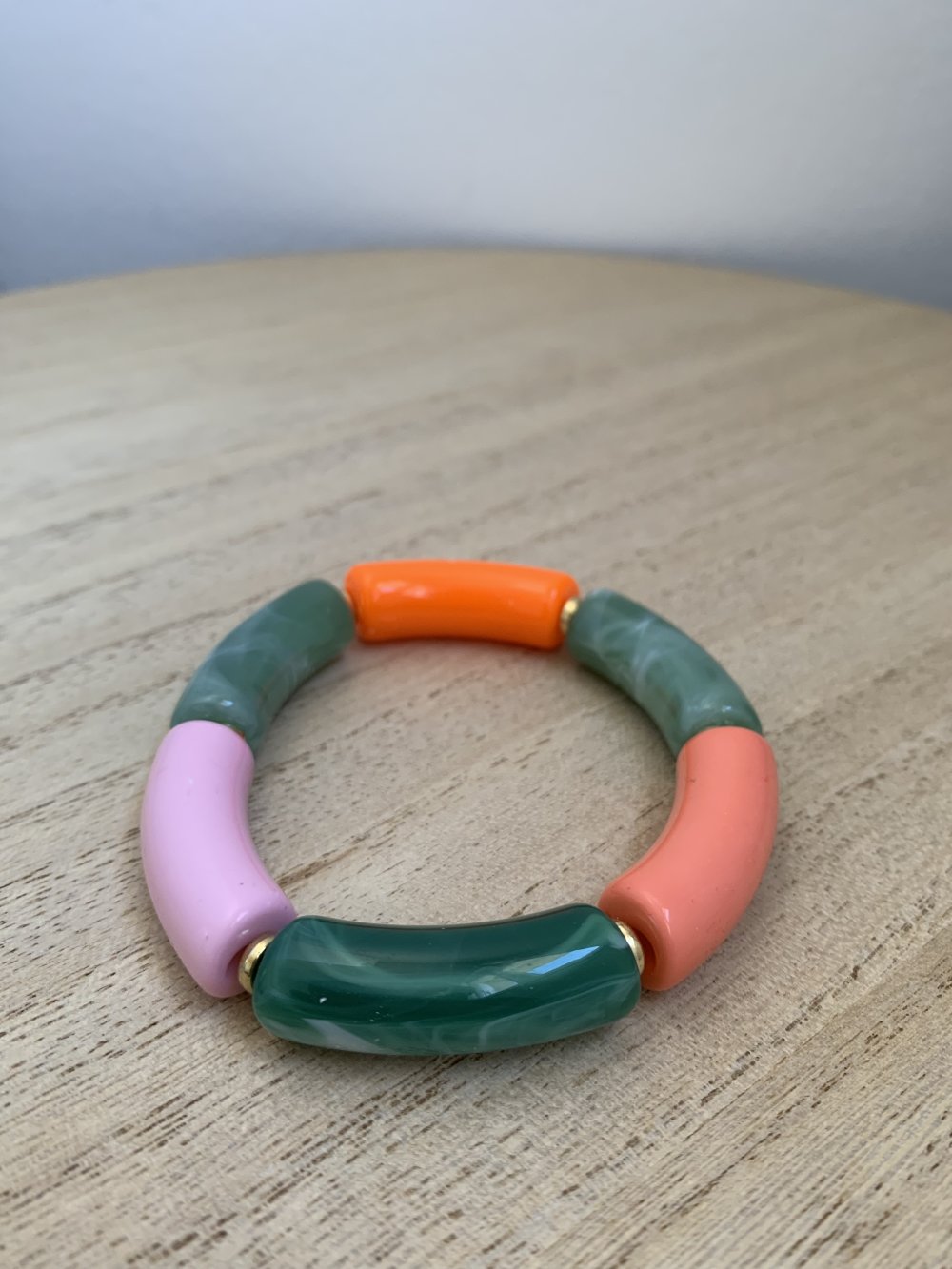 Bracelet élastique avec perles acryliques incurvées. Modèle unique ! Attention les petits intercalaires ne sont pas en acier inoxydable.
