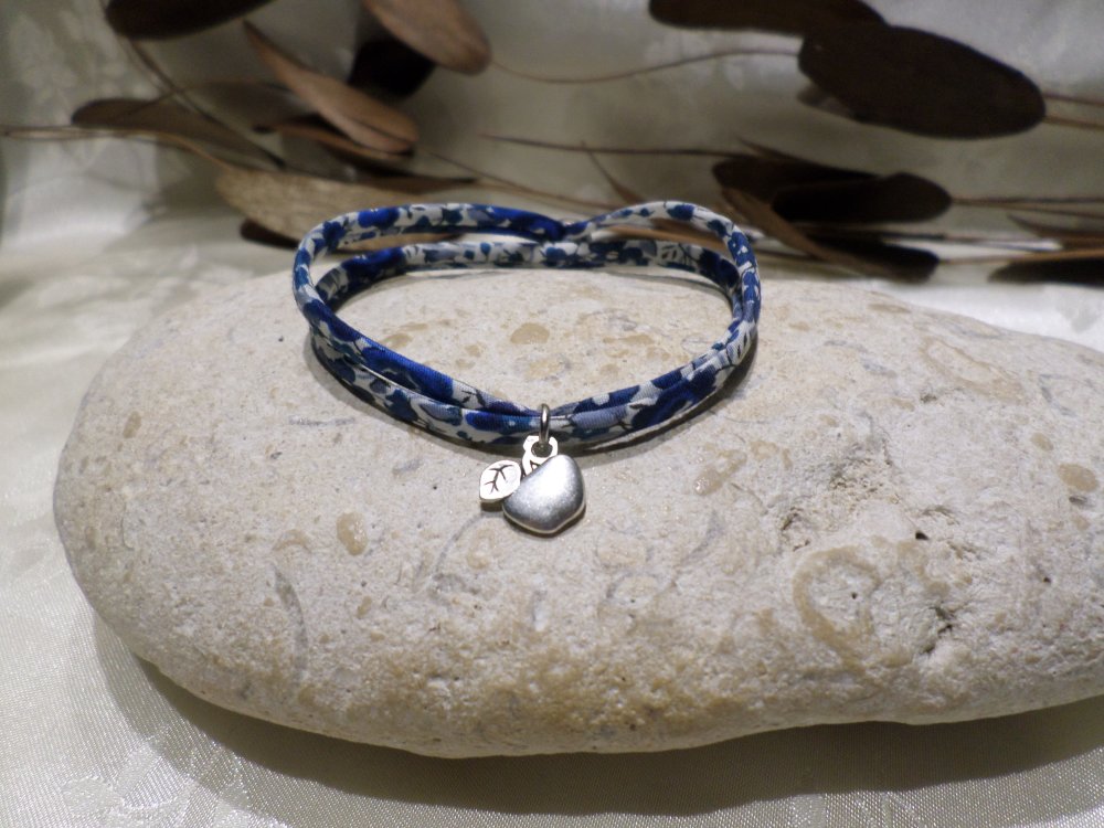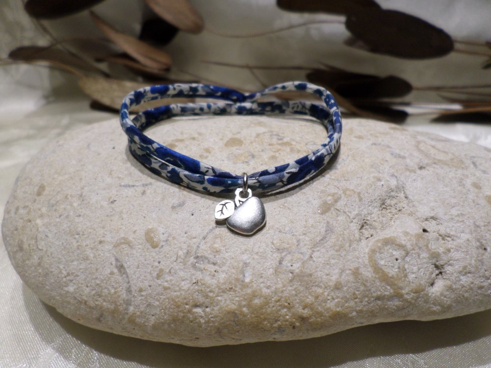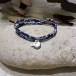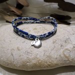 Bracelet femme adolescente en cordon tissu Liberty fleuri bleu, agrémenté d'un pendentif pomme argenté. Un bijou fait main, original et plein de fantaisie, parfait pour un cadeau de Noël, anniversaire, ou Fête des mères