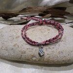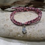 Bracelet en tissu Liberty rose fleuri, orné d'un pendentif en forme de dé. Un bijou délicat, original, idéal en cadeau à une femme ou adolescente pour un Anniversaire, Noël, Fête des mères