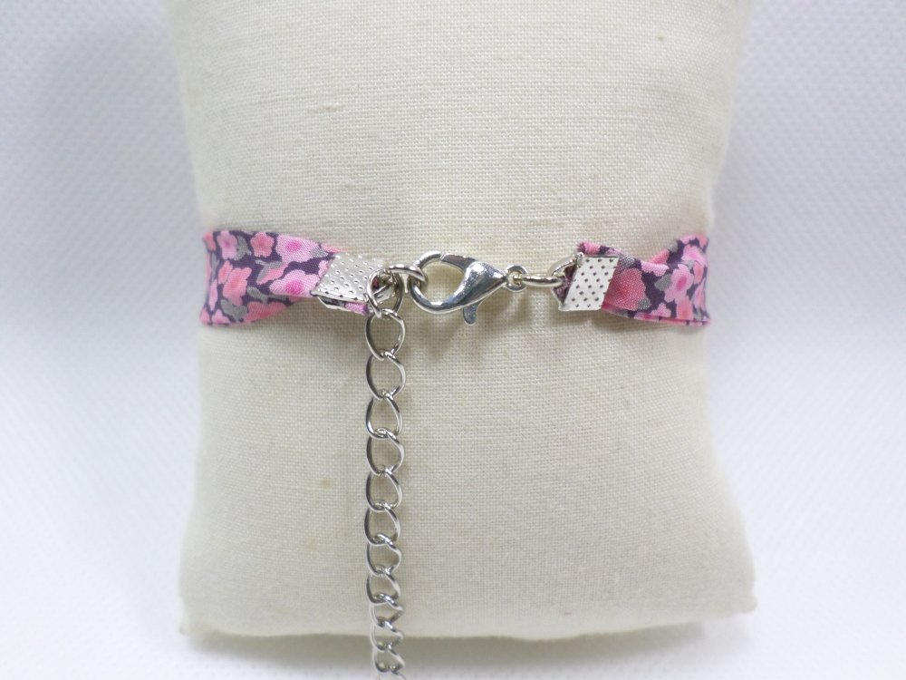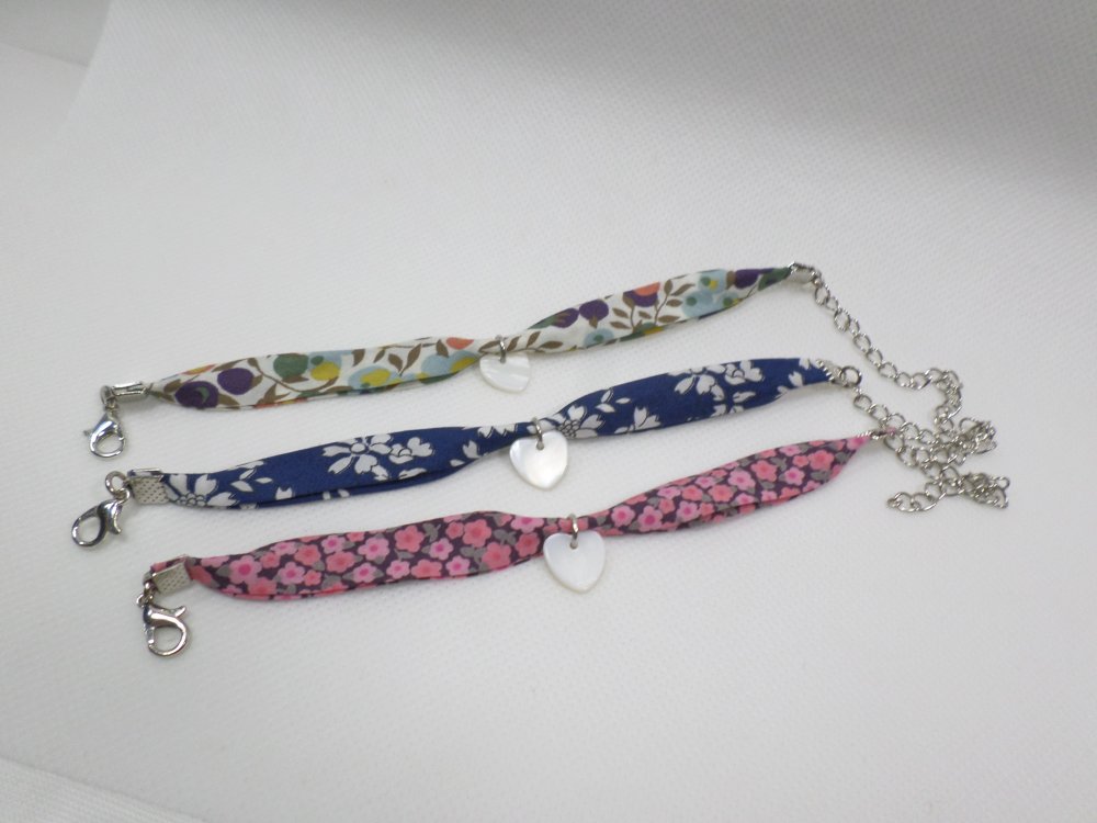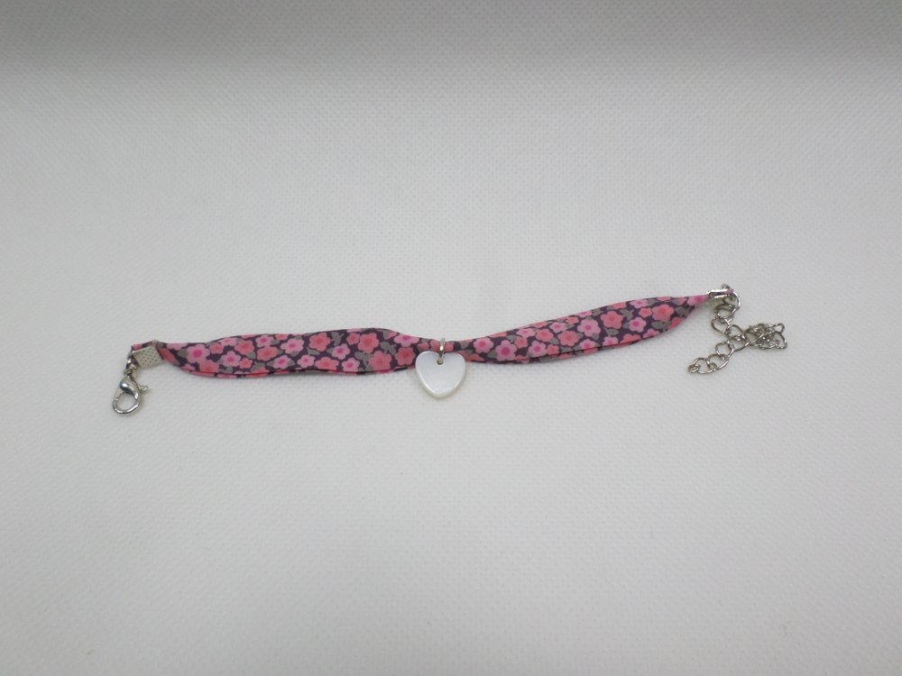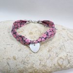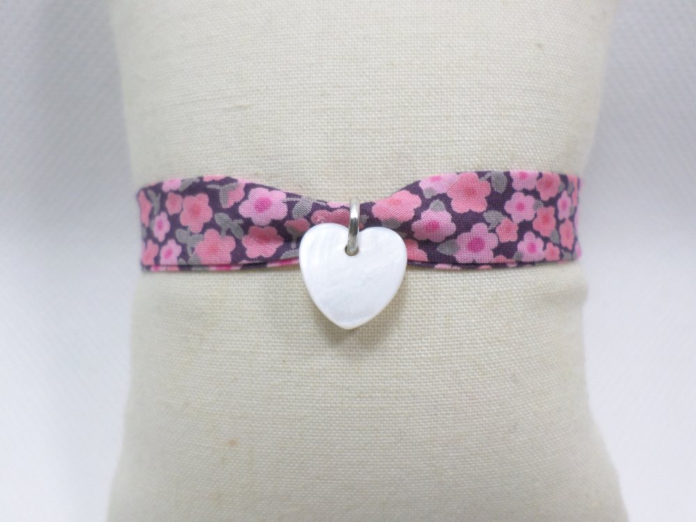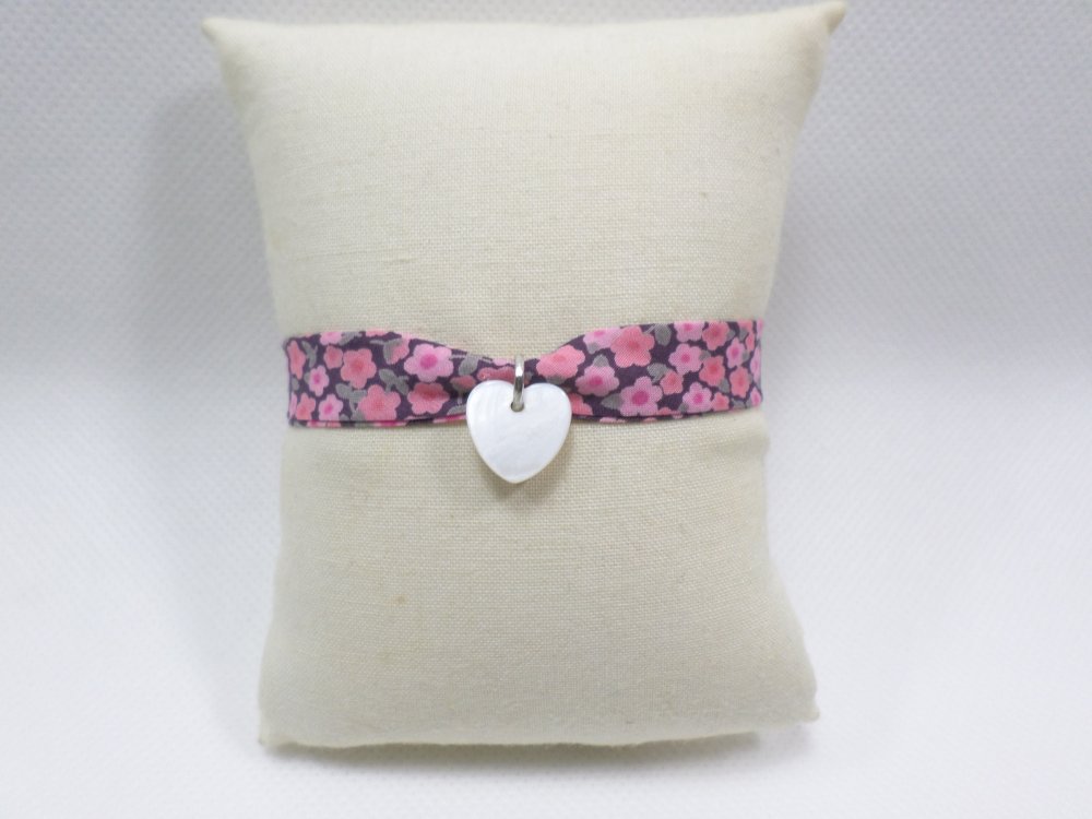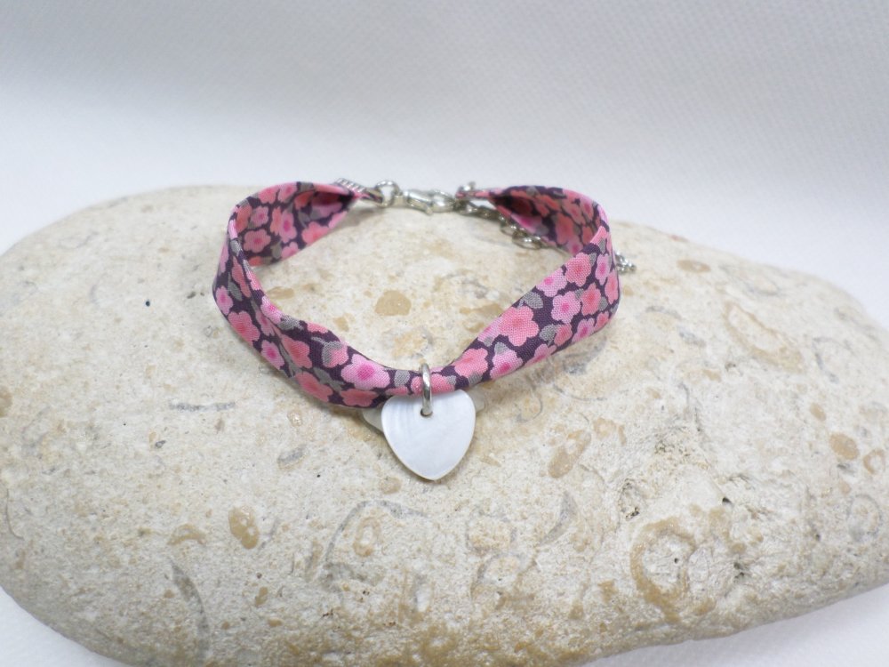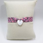 Un bracelet poétique en tissu Liberty fleuri rose, agrémenté d'un petit cœur en nacre. Une touche bohème, idéale à offrir pour un anniversaire, Noël, ou tout autre occasion spéciale.