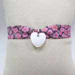 Craquez pour ce bracelet original et intemporel confectionné à la main avec un joli biais en tissu Liberty fleuri rose et gris. Son motif floral raffiné s'accorde parfaitement avec le pendentif cœur en nacre naturelle, pour un bijou délicat plein de douceur.