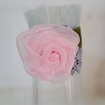 Un bracelet manchette , création unique , dans les tons rose , vert , gris , mélant tulle, velours , dentelle et strass coloré.