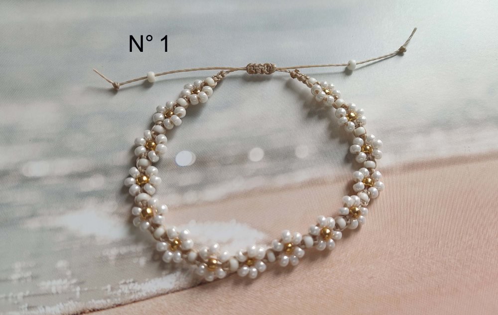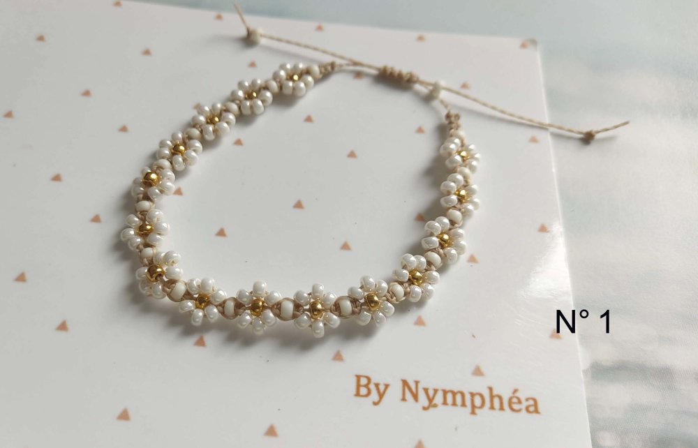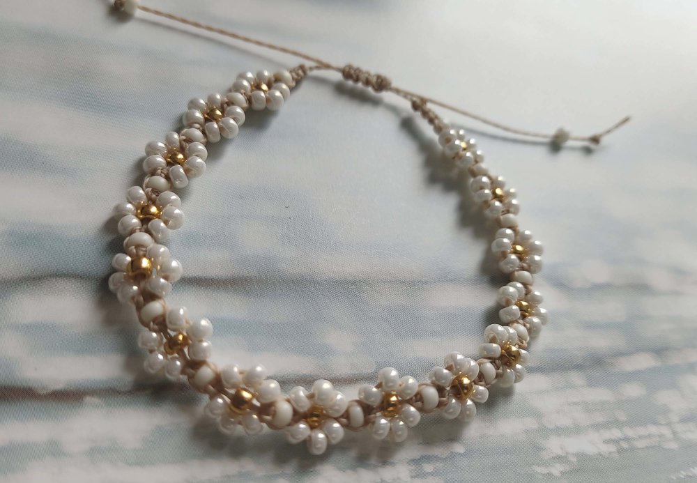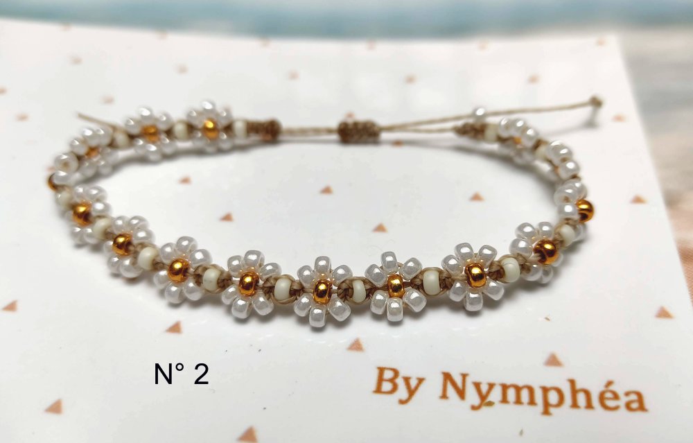 Bracelet petites fleurs marguerites en verre tissé à la main avec noeud coulissant en macramé, bracelet bohème nacré