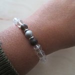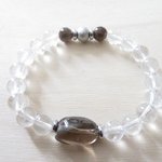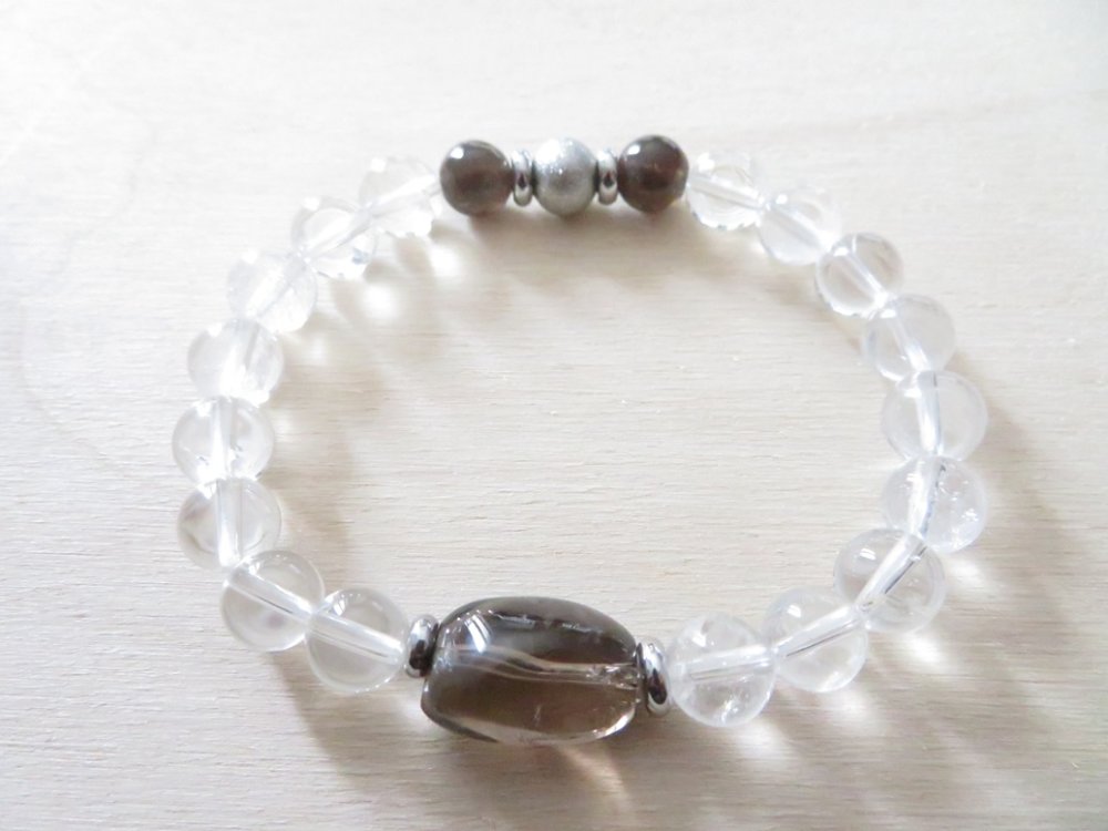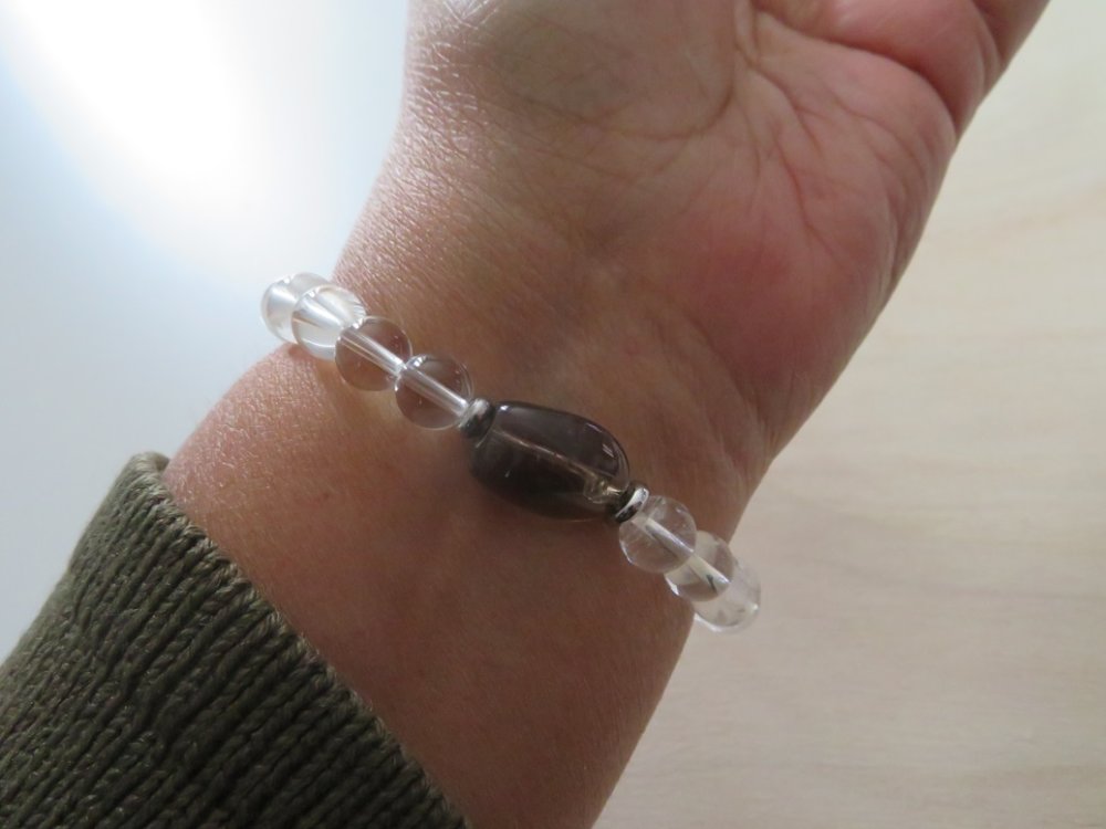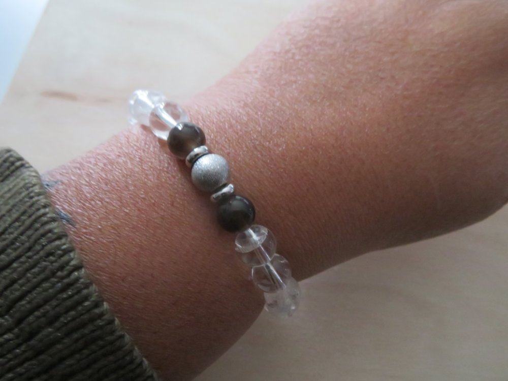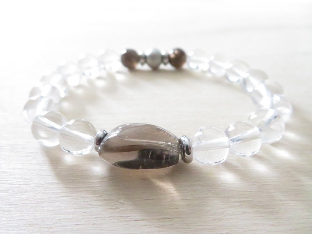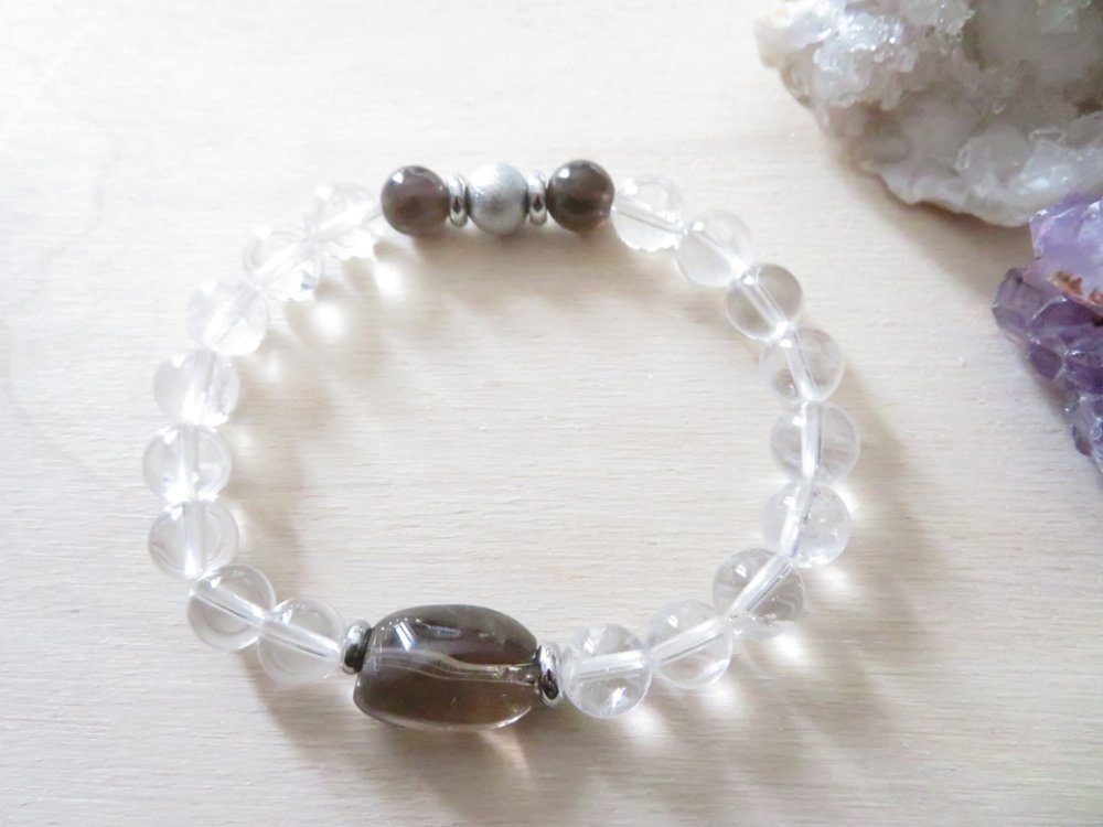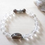 Perles naturelles Cristal de roche (8 mm), Perles naturelles Quartz fumé (rondes 7 mm et forme baroque), Entretoises en acier inoxydable