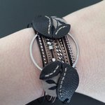 . Design : ce bijou se compose d'une pièce centrale ornée d'un anneau sublimé par des éléments de cuir et de tissu noir et marron finement travaillés et cousus à la main. Les multiples rangs de chaînes et de cordons, dont certains sont ornés de perles, ajoutent une touche de raffinement à ce bracelet. Chaque détail est pensé pour créer une harmonie parfaite entre les matériaux et les textures, offrant ainsi un accessoire qui se distingue par son originalité et son charme.