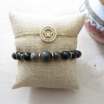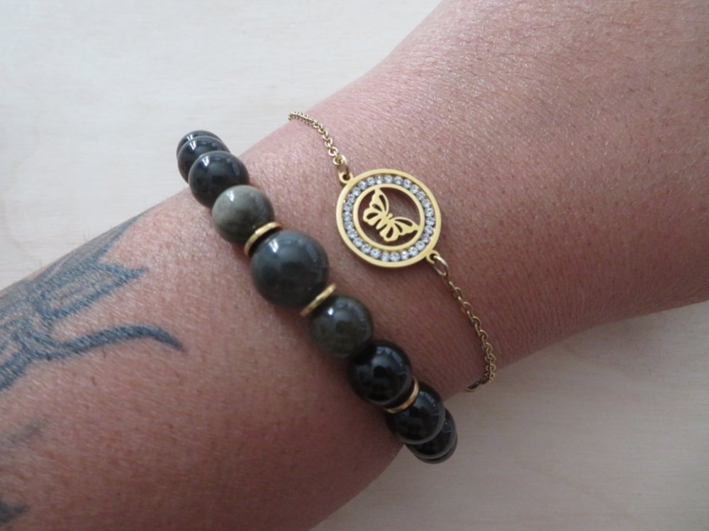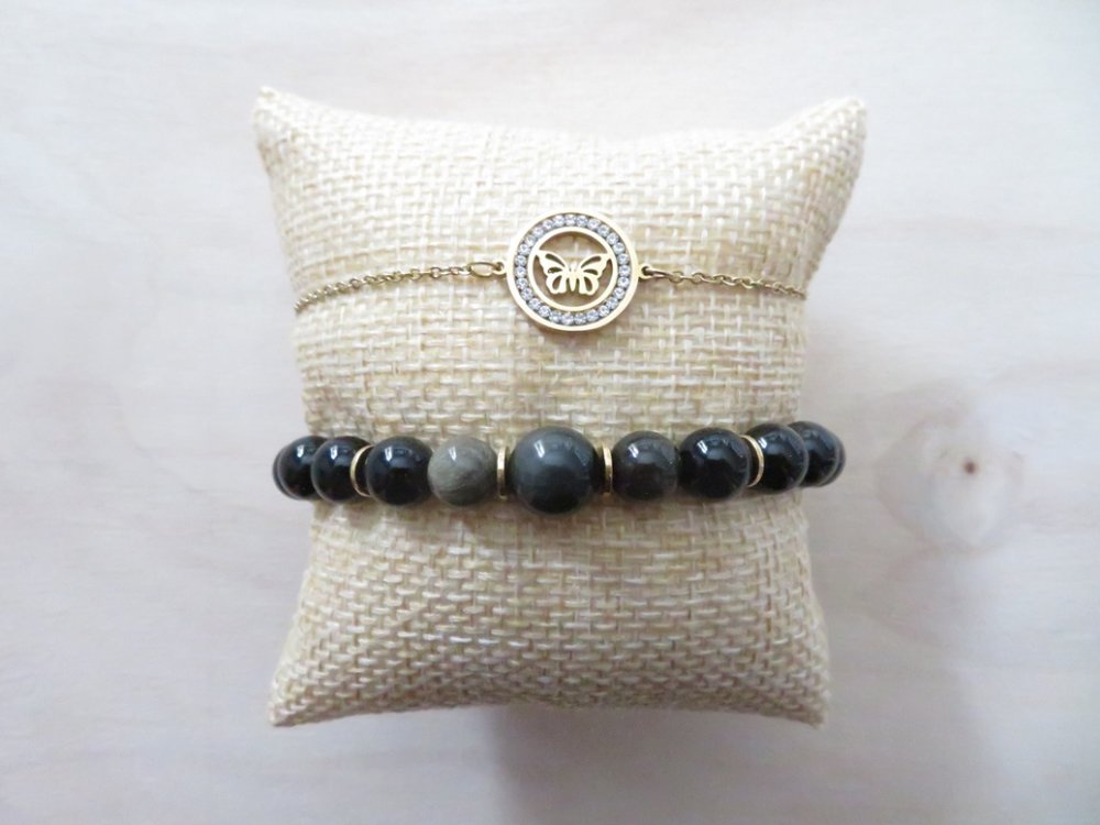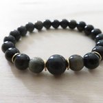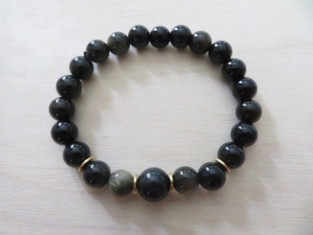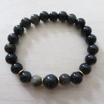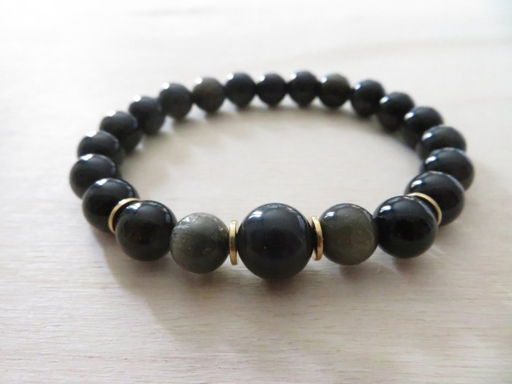 - 1 bracelet en pierres naturelles Obsidienne dorée 8 mm et 10 mm avec entretoises en acier inoxydable or monté sur un fil élastique – Bracelet de 18 cm (possible de faire une autre taille sur demande)