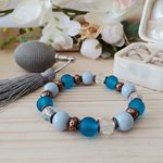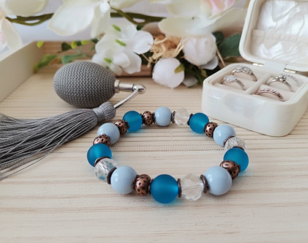 Bracelet sur fil élastique avec perle 10 mm en verre givré bleue, perles bleu pale, perles à facette cristal et apprêts de couleur cuivre rouge