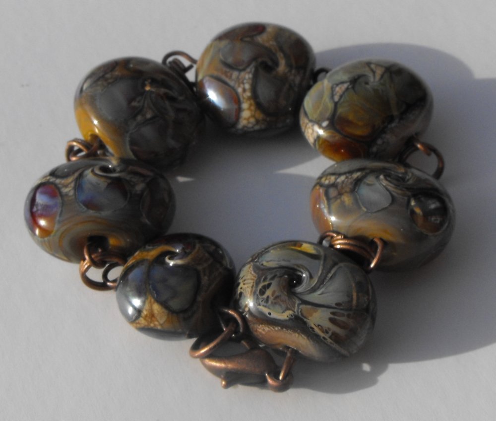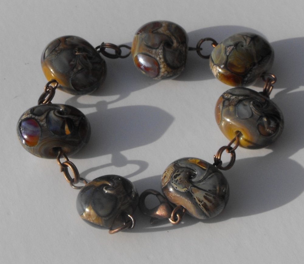 Fileuse de verre au chalumeau, je réalise moi-même la plupart des perles qui ornent mes créations. Le verre est recuit dans un four spécial de perlier pour garantir sa solidité et sa longévité.