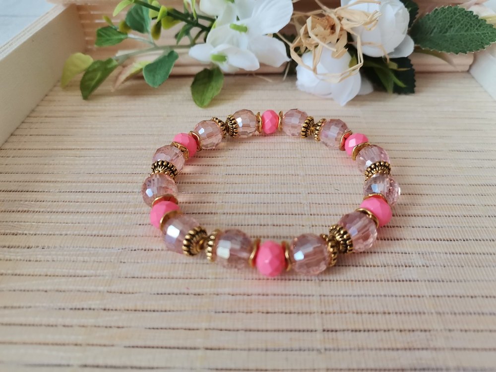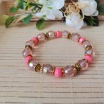 Bracelet sur fil élastique avec perles en verre laqué à facette de 10 mm de couleur saumon, perles en verre à facette 8 mm de couleur orange et apprêts de couleur doré