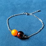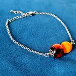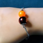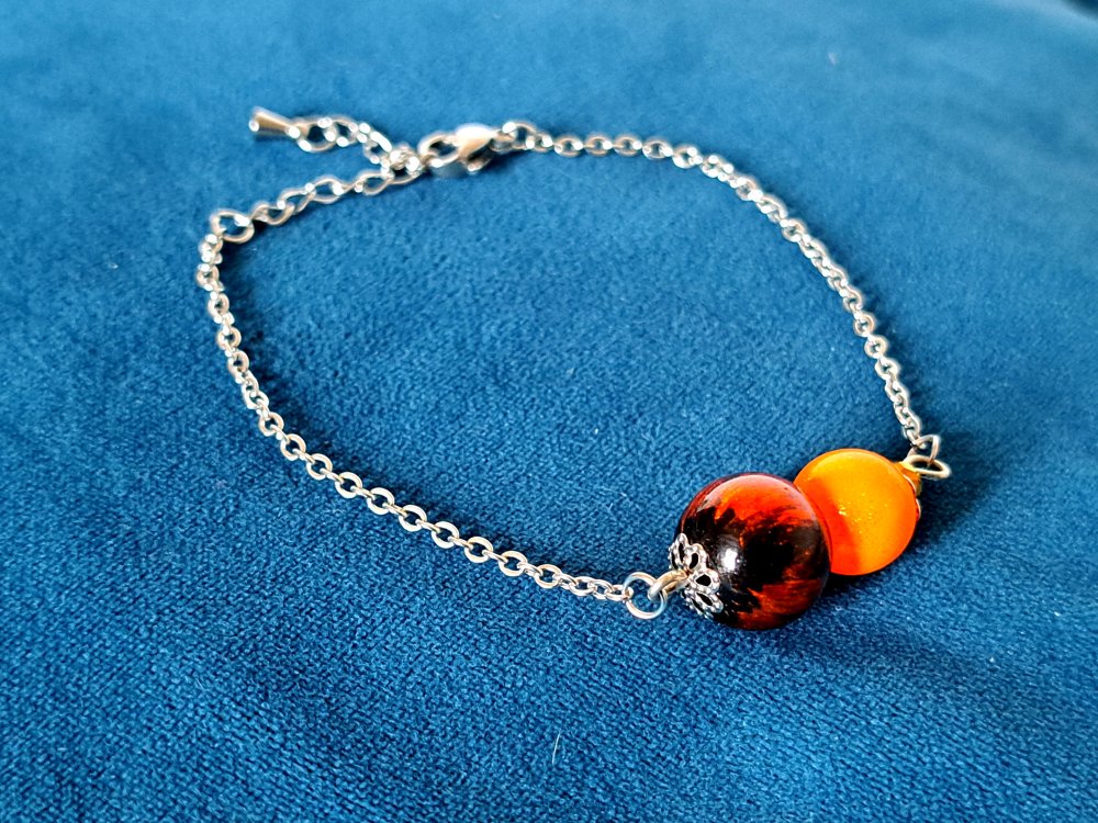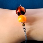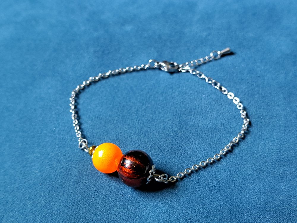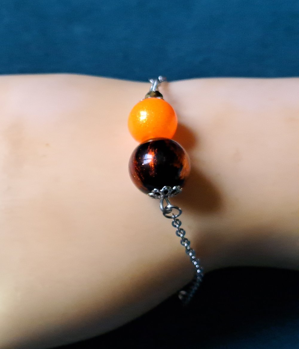 bracelet perles en verre orange, noir, chaîne, fermoir en métal acier Inoxydable argenté