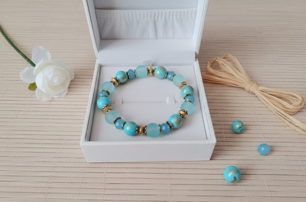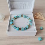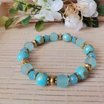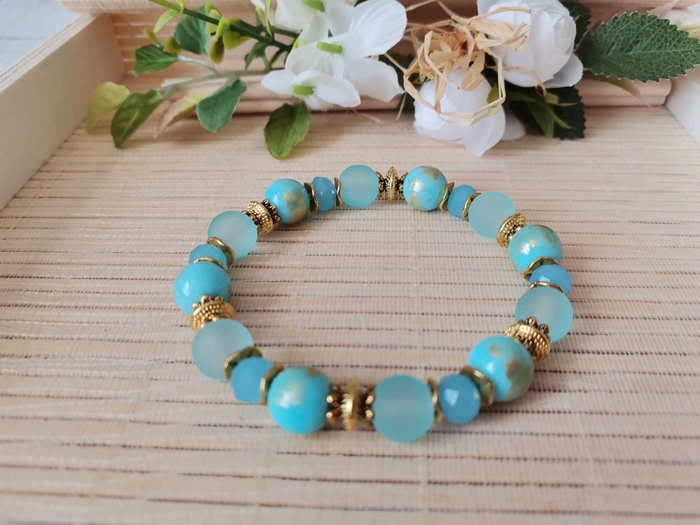 Bracelet sur fil élastique avec perles en verre jade bleu taches dorées et verre givré de 10 mm de couleur bleu et apprêts de couleur doré