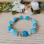 Bracelet sur fil élastique avec perles jade bleue et verre imitation jade de 10 mm de couleur bleue et apprêts de couleur argent mat