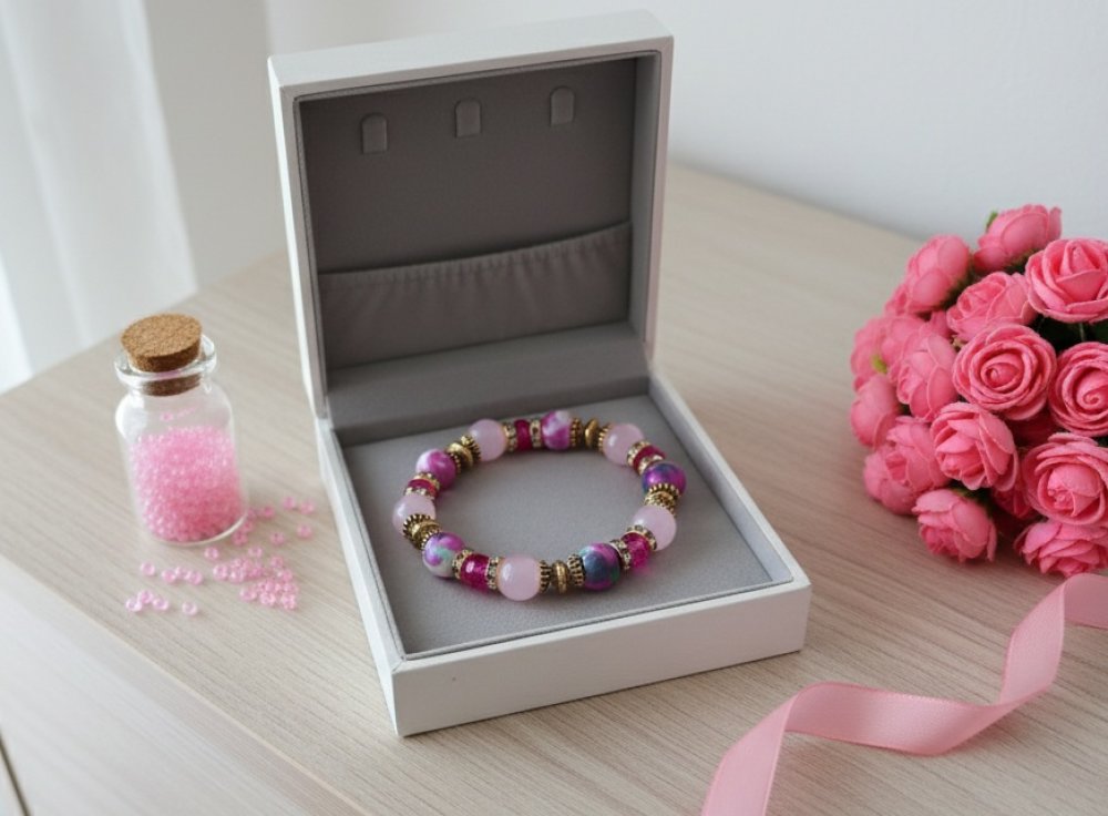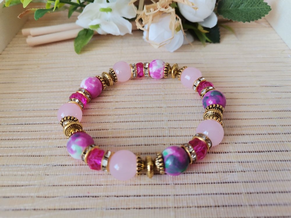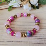 Bracelet sur fil élastique avec perles en verre jade violettes taches multicolores et verre imitation jade de 10 mm de couleur rose pale, perles rondelles strass doré et apprêts de couleur doré