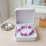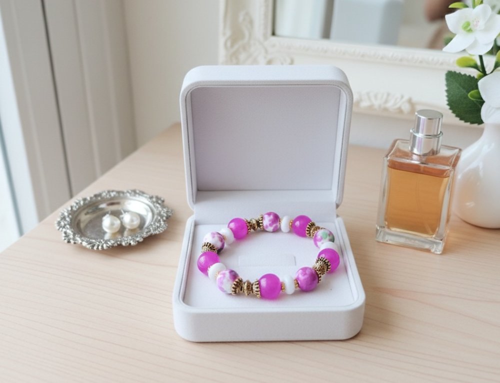Bracelet sur fil élastique avec perles jade fuchsia et blanc, perles en verre imitation jade de 10 mm et apprêts de couleur doré