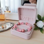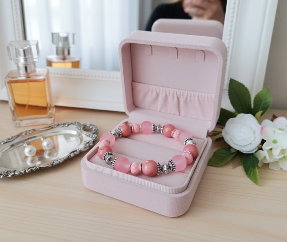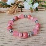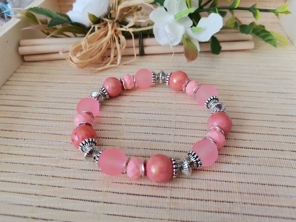 Bracelet sur fil élastique avec perles en verre jade rose et verre givré de 10 mm de couleur rose et apprêts de couleur argent mat